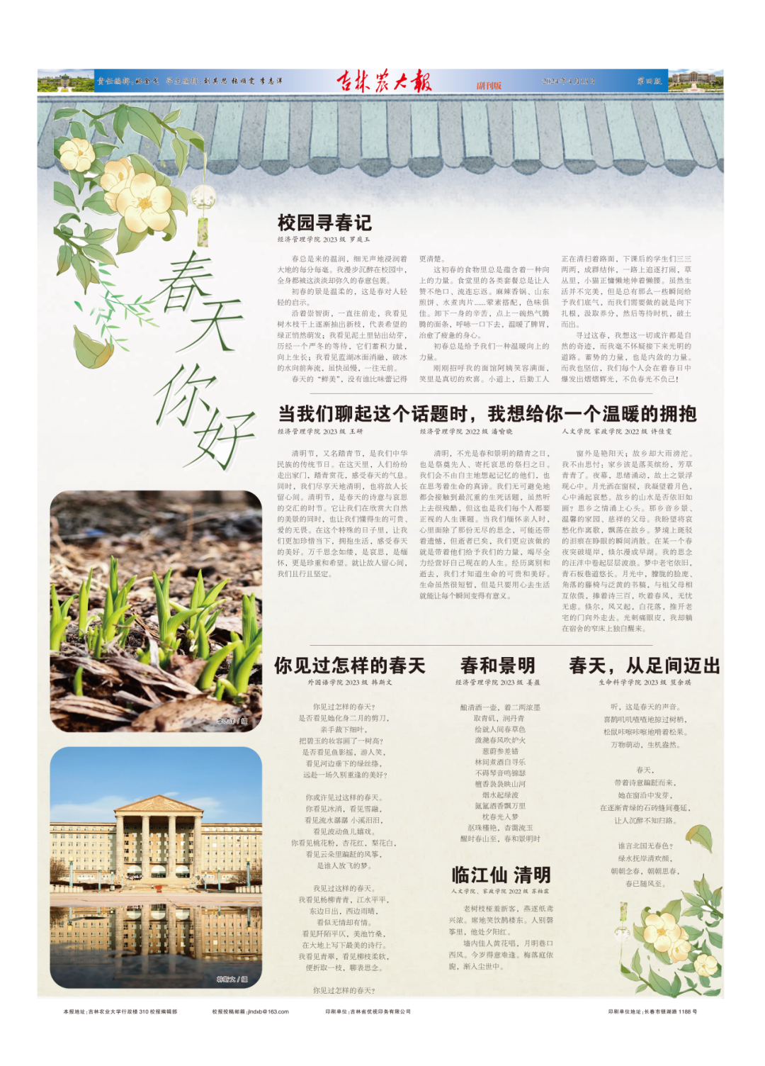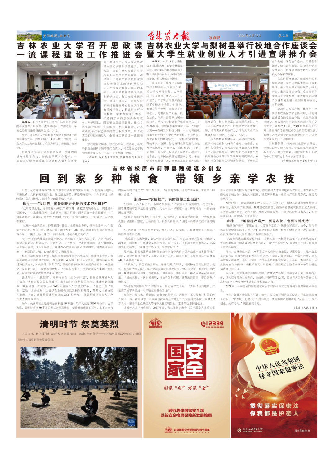 要闻 ♦ 景俊海在省农业科学院和吉林农业大学调研时强调 加快发展农业领域新质生产力 推动科技创新突破 助力产业质效提升 ♦ 吉林农业大学召开党建示范创建和质量创优工作推进会 ♦ 吉林农业大学与中国农业银行吉林省分行签署全面战略合作协议 ♦ 吉林农业大学举行《吉林农业大学学报》第十四届编辑委员会会议 ♦ 吉林农业大学召开新一轮本科教育教学审核评估常模高校选择及本科招生工作汇报会 视点 ♦ 吉林农业大学召开思政课一流课程建设工作推进会 ♦ 吉林农业大学与梨树县举行校地合作座谈会暨大学生就业创业人才引进宣讲推介会 ♦ 吉林省松原市前郭县魏健返乡创业 回到家乡种粮食 带领乡亲学农技 校园 ♦ 吉林农大的夜 与你温暖相伴 副刊 ♦ 校园寻春记 | 第625期 吉林农大报 |