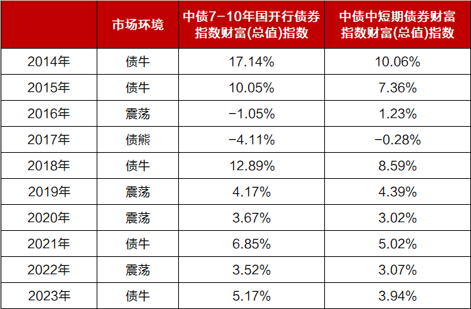 我们可以从对风险波动的承受能力,以及资金的使用需求来选择判断。把7-10年长债指数和中短期债券指数的收益波动情况放在一起进行对比,就会比较清晰了。越长久期(7-10年)的债基,理论上的收益空间和回撤波动都会相对更大。债牛行情下,业绩相对会更好,债熊环境下,回撤也会更大一些。近10个完整年度“长久期债”和“短久期债”收益表现