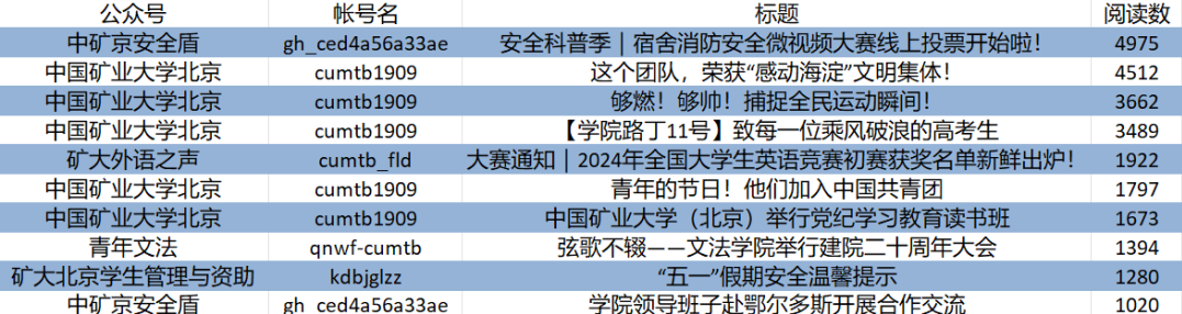校级组织微信公众号影响力排行榜中,中国矿业大学北京排名第一,中国矿业大学北京学生会排名第二,I青春I矿大排名第三。