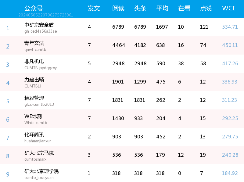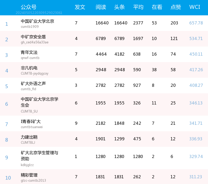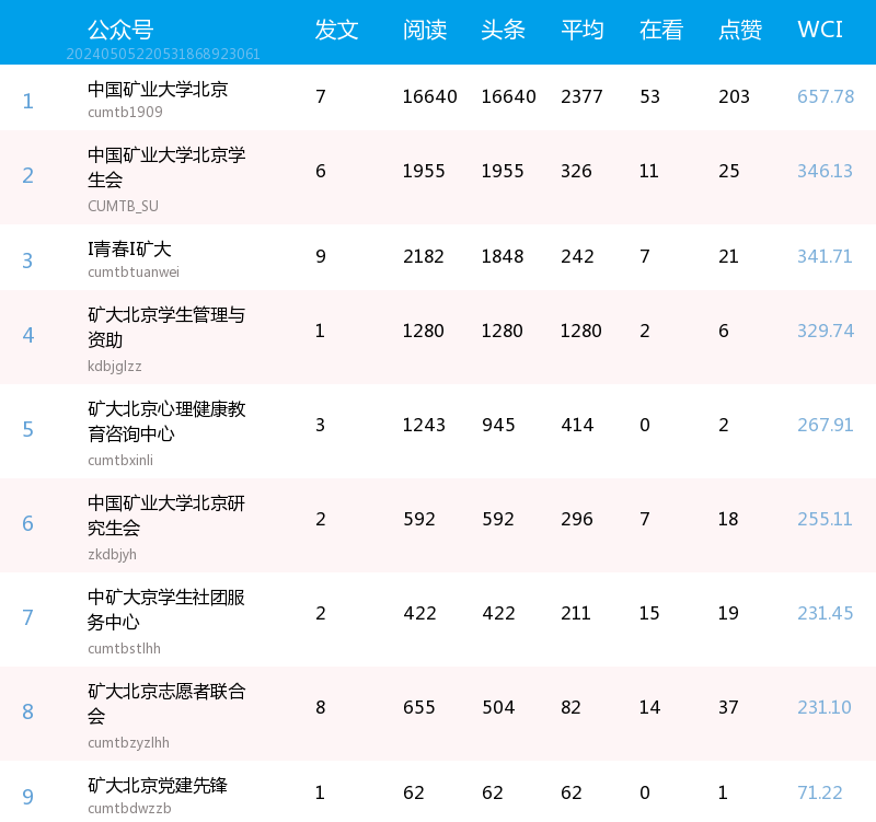 总榜数据显示,本周中国矿业大学北京以657.78分、总阅读量16640的成绩获得榜单第一名,中矿京安全盾以534.71分的成绩位居第二,阅读量为6789,青年文法排名第三。