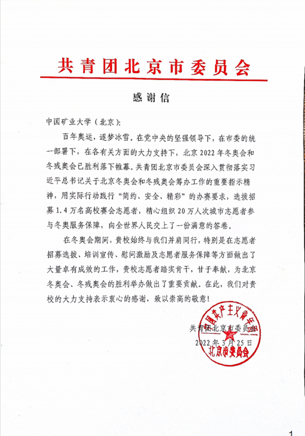 共青团北京市委员会、北京奥林匹克公园公共区运行团队给我校发来感谢信