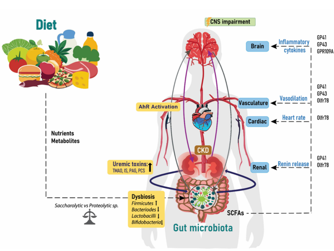 图3:饮食、肠道、大脑和CKD。肠道菌群、肾脏和大脑之间的关系是一个循环过程,受饮食选择中营养物质和代谢产物的影响。细菌变化增加会导致生物失调,从而增加尿毒症毒素释放到循环中,激活AhR受体,进而影响中枢神经系统。来自肠道微生物群的SCFAs数量通过作用于所列蛋白质影响肾肾素释放、心率、血管舒张和炎性细胞因子。IS:硫酸吲哚氧基;PCS:对甲酚硫酸盐;TMAO:三甲胺N-氧化物;PAG:苯乙酰谷氨酰胺;CKD:慢性肾脏病;短链脂肪酸;中枢神经系统和芳香烃受体。