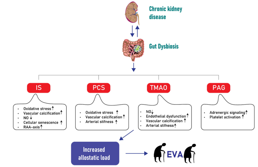 肠源性尿毒症毒素如IS和PCS可促进炎症、氧化应激和内皮功能障碍,这些是EVA的关键因素。这些毒素激活炎症通路并增加ROS的产生,从而导致血管内皮细胞受损和血管张力的正常调节受损,促进动脉粥样硬化斑块的形成和心血管风险增加。尿毒症毒素可直接影响动脉壁的结构和组成,促进胶原沉积和钙化,这有助于动脉钙化和僵硬的发展,这是EVA的一个标志。