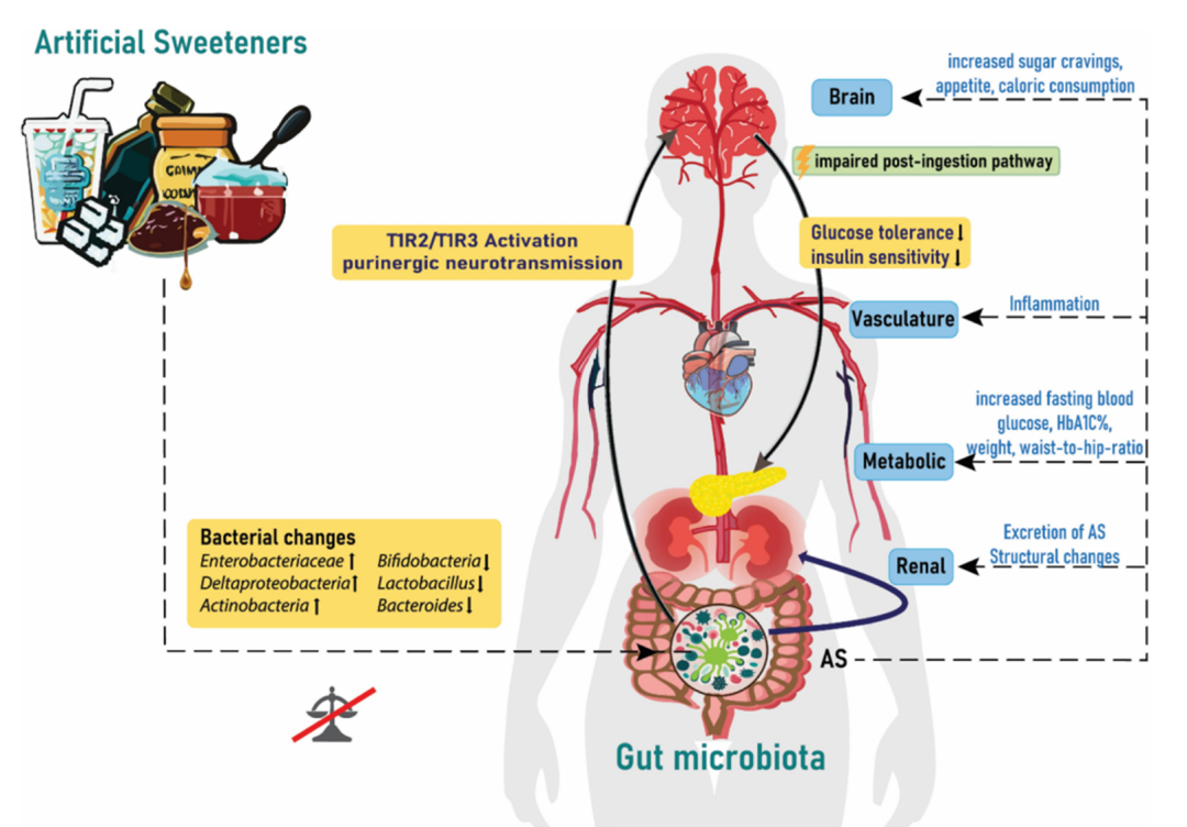 人工甜味剂最初是作为一种健康的替代品引入的,因为其低或零卡路里含量,这被认为有利于体重管理和血糖水平管理。然而,新出现的研究表明,这些人工甜味剂通过对摄入后途径反应和肠道微生物群等非预期影响,导致或恶化其本应缓解的躯体状态。事实上,已在小鼠和人类中表明,摄入NNS(如阿斯巴甜和三氯蔗糖)会恶化糖耐量,大多数人工甜味剂的甜度是蔗糖的100倍,使用量很少,但它们能够激活口咽中的异二聚体G蛋白偶联甜味受体味觉受体1型成员2(taste receptors taste receptor type 1 member 2 , T1R2)和味觉受体1型成员3(taste receptor type 1 member 3 , T1R3),在预期营养时,触发激素反应、预期或从杏仁核和下丘脑进行头期胰岛素释放。在肠中,十二指肠神经元与迷走神经细胞突触,将糖刺激传递到大脑。这些细胞还可以利用甜味受体和钠-葡萄糖转运体来区分糖和甜味剂。糖刺激谷氨酸能神经传递,甜味剂刺激嘌呤能神经传递。但人工甜味剂没有或很少热值,摄入后途径的激素反馈缺乏或减弱。最终,通过NNS缺乏代谢能量摄入会抑制激素反应和饱腹感和能量代谢的有效性,导致增加糖渴求、食欲、热量消耗和高血糖。