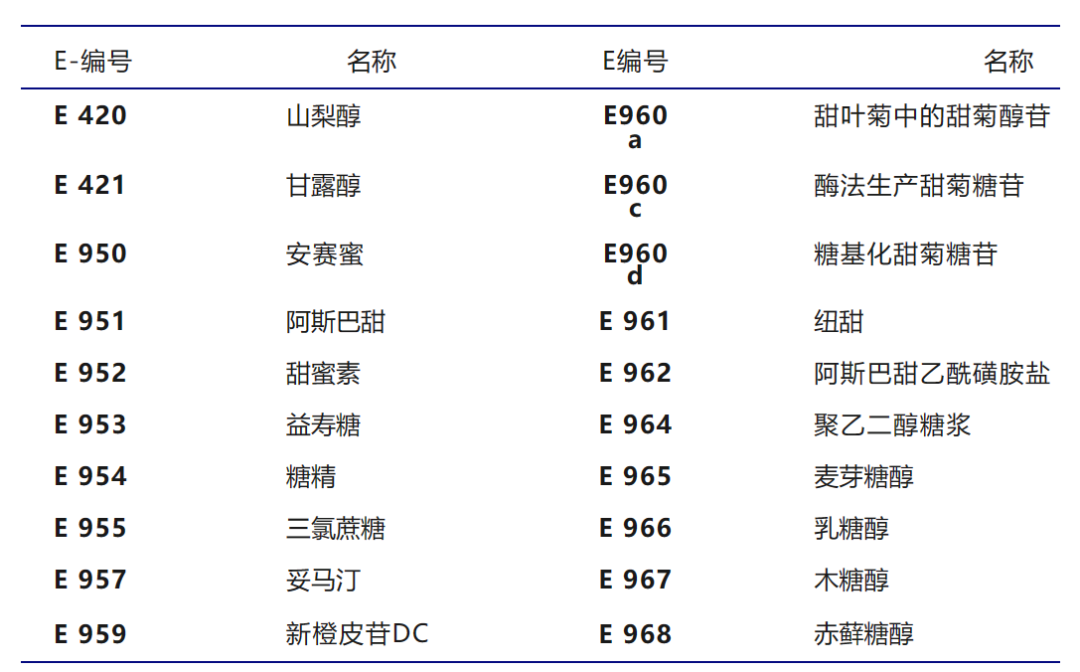 表1:根据欧洲食品安全局,欧盟授权甜味剂清单