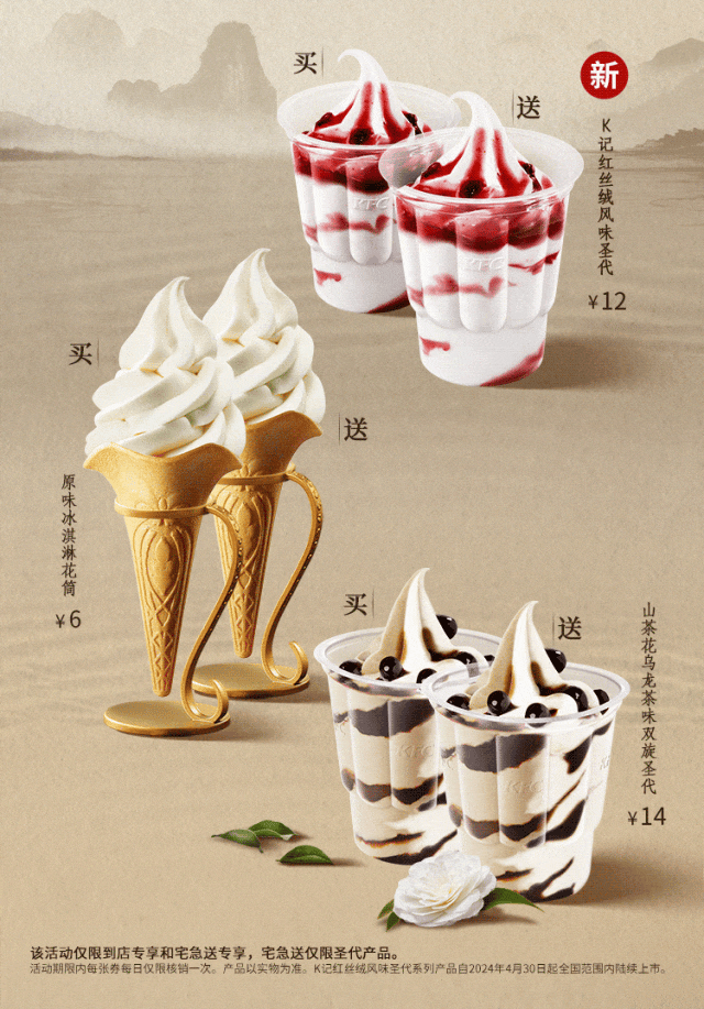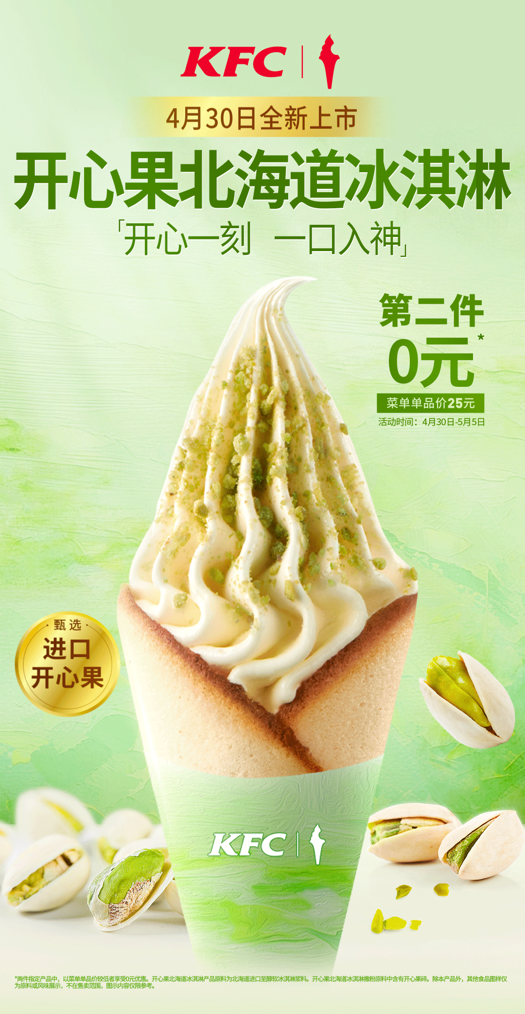 活动自2024年4月30日起至5月5日。活动渠道:堂食-柜台点餐/堂食-自助点餐机/堂食-自助点餐到店自取/肯德基甜品站/K咖啡速取窗。活动时间:堂食仅限9:30-23:00供应,广东省、福建省、海南省、广西壮族自治区等部分地区仅限10:30-23:00供应,甜品站和K咖啡速取窗仅限10:00-22:00,具体供应时间以肯德基餐厅/肯德基甜品站/K咖啡速取窗实际营业时间为准。活动地区:全国。活动期间,在部分肯德基甜品站、部分肯德基餐厅、部分K咖啡速取窗到店或自助点餐到店自取时,以菜单单品价点购指定产品1份,可以0元享第二件指定产品。两件指定产品中,以菜单单品价较低者享受0元优惠。指定产品可选范围:开心果北海道冰淇淋、恋与玫瑰北海道冰淇淋、北海道冰淇淋(原味)、北海道冰淇淋(抹茶味)、北海道冰淇淋(巧克力味),具体情况以餐厅餐牌公示为准。开心果北海道冰淇淋产品原料为北海道进口至醇软冰淇淋浆料。开心果北海道冰淇淋撒粉原料中含有开心果碎。除本产品外,其他食品图样仅为原料或风味展示,不在售卖范围。图示内容仅供参考。产品及包装以实物为准。开心果北海道冰淇淋自2024年4月30日起在全国陆续上市,共限量7万个,售完即止。仅限有此产品供应的部分肯德基餐厅,交通枢纽、旅游景区、西藏自治区的餐厅及精选餐厅等部分餐厅除外,具体情况以餐厅餐牌公示为准。不与其他优惠共享。