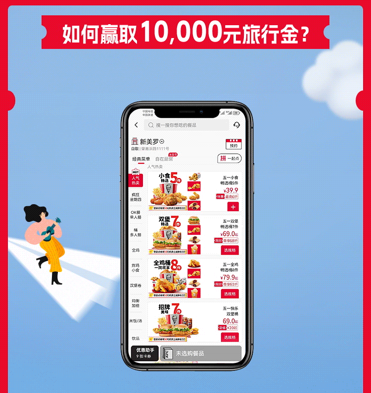 (二)在订单送达后,获得“万元旅行金”抽奖券1张。凭抽奖券参与当日抽奖活动,有机会获得“飞猪10000元通用优惠券”1份。每个有效订单完成后仅限获得1张抽奖券。每个活动日23:30-24:00,从当日成功参与活动的用户抽奖券编号中随机抽出1个中奖用户,获得奖品1份。每个活动日1个名额,整个活动期间,共计10个名额。活动期间,同一用户不可重复中奖。用户可在每个活动日结束的2个工作日后,登录肯德基超级APP内查看中奖结果。抽奖活动规则详情请见活动页面。