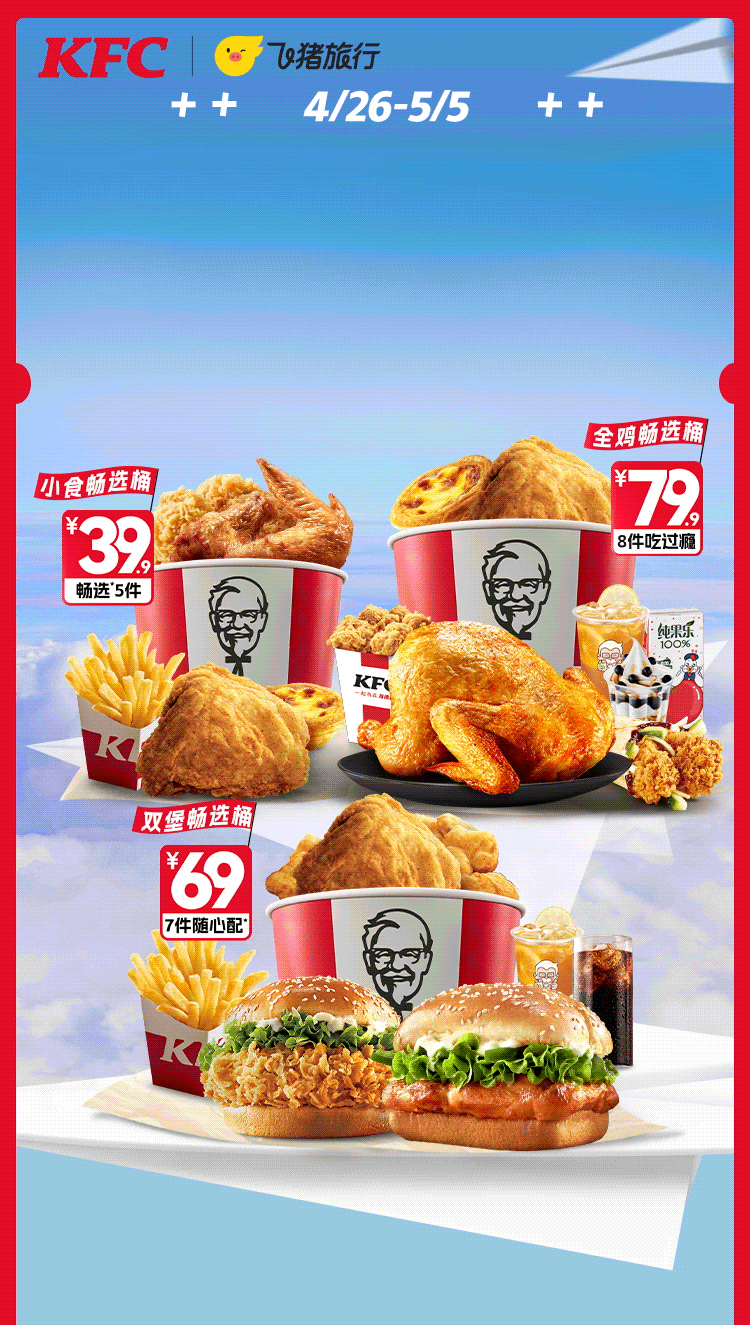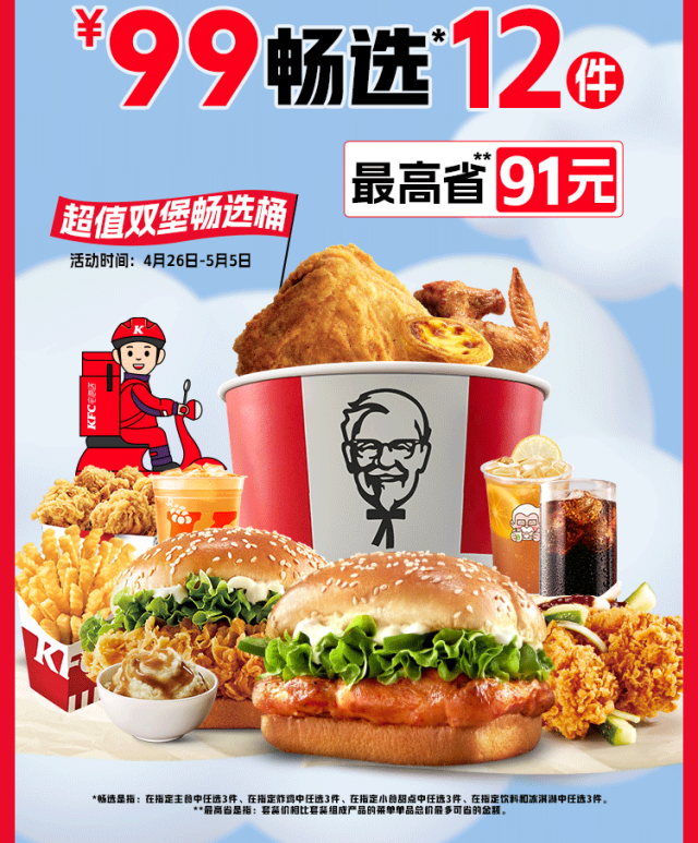 超值双堡畅选桶(外送版)、超值全鸡畅选桶(外送版)、五一快乐双堡桶自2024年4月26日起至2024年5月5日上市。活动期间,可以指定金额在指定品类中任选指定数量的指定产品,详情以菜单显示为准。