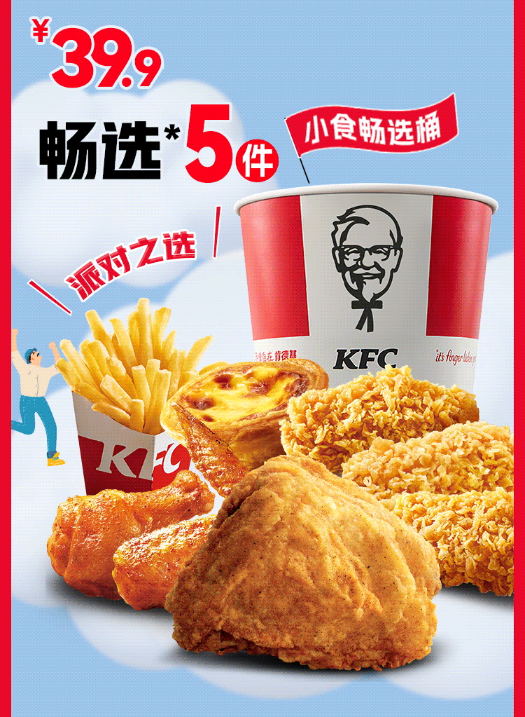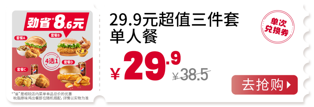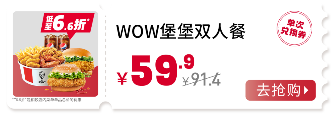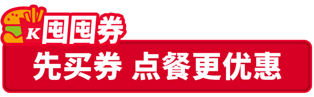 活动渠道:肯德基超级APP外送到家/肯德基+微信小程序外送到家/肯德基支付宝小程序外送到家。活动时间:9:30-23:00。活动地区:全国。外送部分送餐区域不供应此产品,详情以输入地址后显示的菜单及送餐时间为准。除推广产品外,其他物品仅做装饰目的,图示内容仅供参考。产品、周边、玩具及包装以实物为准。不与其他优惠共享。堂食、肯德基宅急送自有渠道、第三方外卖平台外送渠道、甜品站、团购渠道、企业送渠道及其他渠道的产品组合、价格及优惠活动,以各渠道页面展示为准。