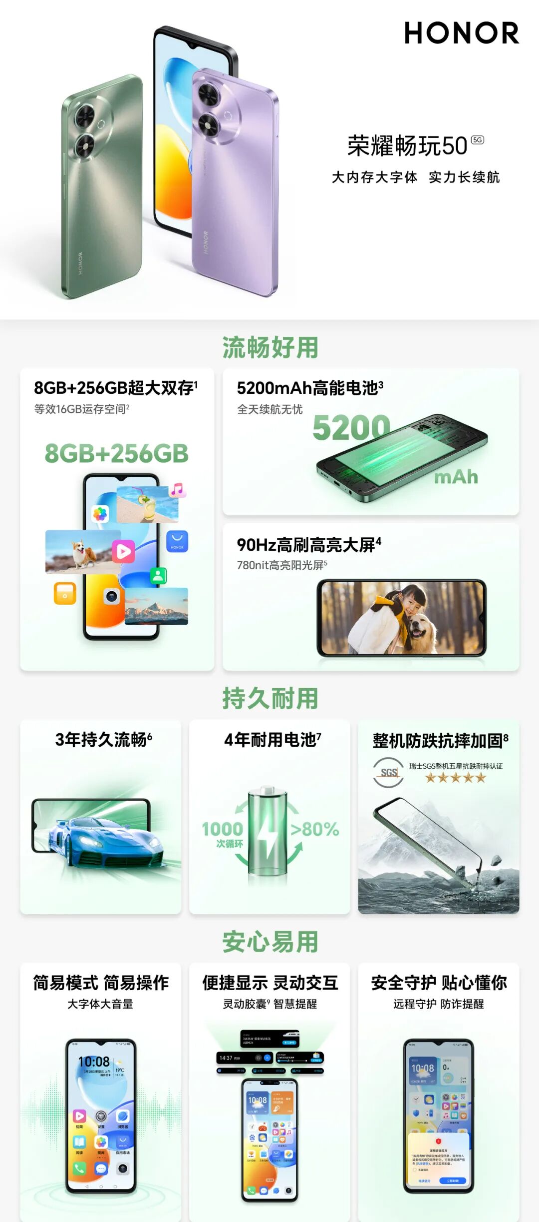作为一款千元档高品质5G手机,荣耀畅玩50在续航、性能配置、显示以及智慧体验方面都有超越档位的表现。它拥有5200mAh高能大电池,带来全天候续航无忧的体验,同时这块电池支持4年耐久抗衰老,使用数年之后依旧续航能力满满;拥有256GB超大储存,可以存储照片60000+张、音乐24000+首;同时支持8GB+8GB智慧运存拓展,带来3年不卡顿的流畅体验;搭载90Hz高刷显示屏,780nit的激发亮度在强光下依旧清晰显示,同时支持灵动胶囊、熄屏AOD等诸多便捷显示功能;在耐摔可靠性上进一步升级,获得瑞士SGS整机五星抗跌耐摔认证,带来整机防跌耐摔安心体验;针对易用体验,荣耀畅玩50支持默认大字体与大音量模式,同时在防诈和远程守护方面进一步升级,带来全面的安心易用体验。
