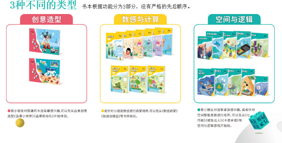 每一款套装都由三种不同类型的书和相关的积木组成。