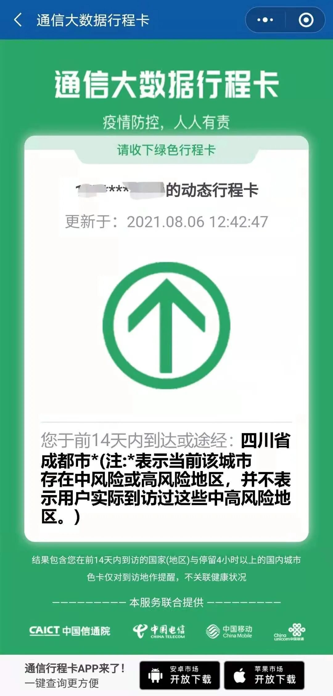 行程卡会显示你过去14天内到达或途经的国家或地区
