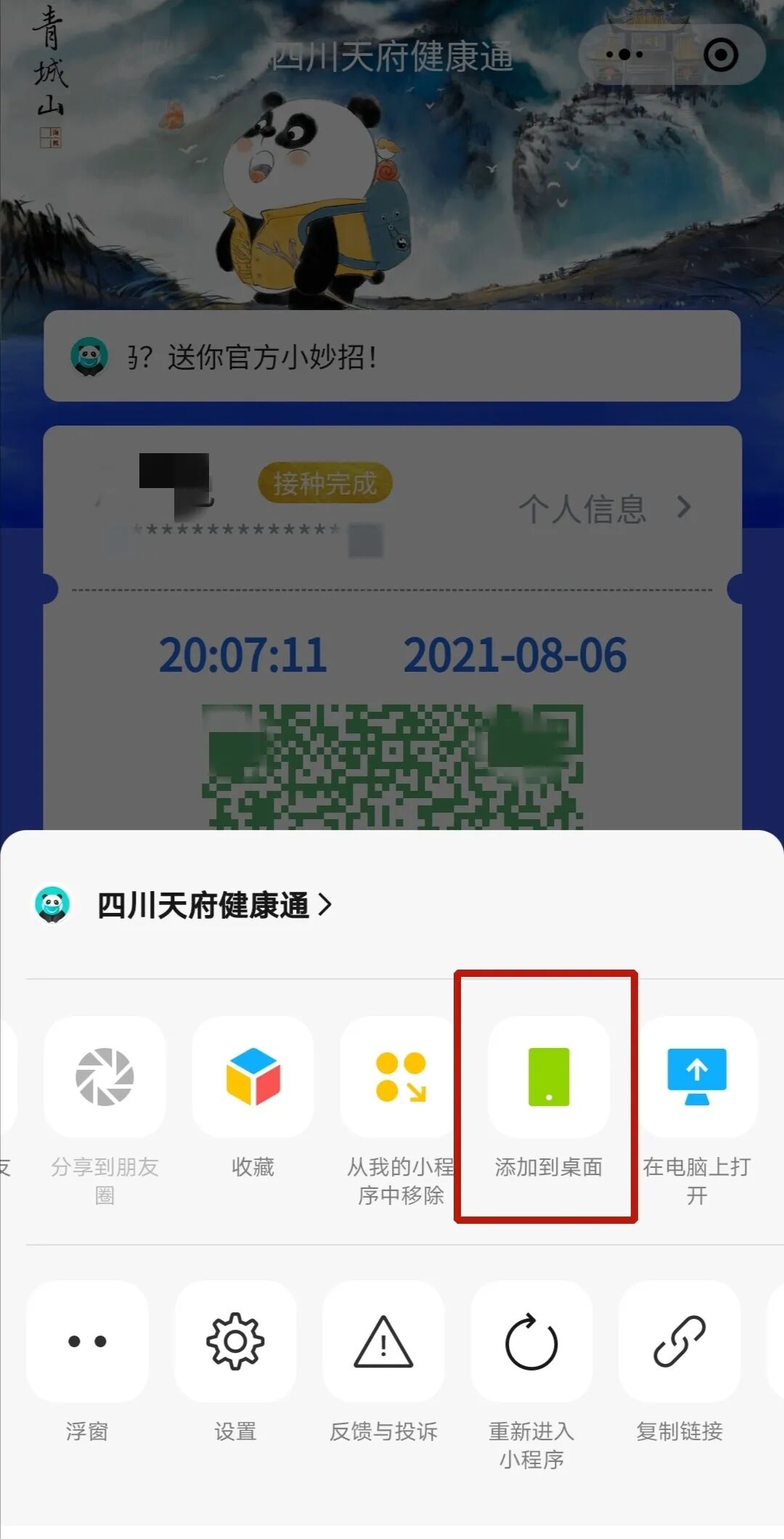 在微信中打开“四川天府健康通”小程序,点击右上角的“…”点击“添加到桌面” 即可。温馨提示:如果未能成功添加到桌面,请查看手机的权限设置,为微信打开“创建桌面快捷方式”权限。(PS:此攻略适用安卓手机系统)