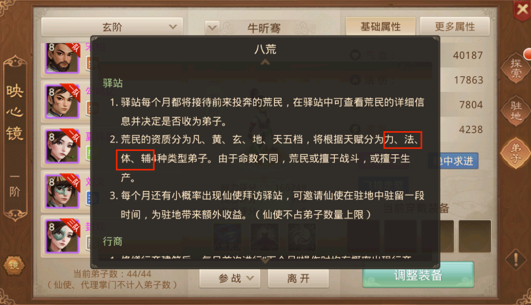 八荒驿站的说明中,弟子属性有【力、法、防、辅】,但实际力系为【物】,建议可以优化规则说明。