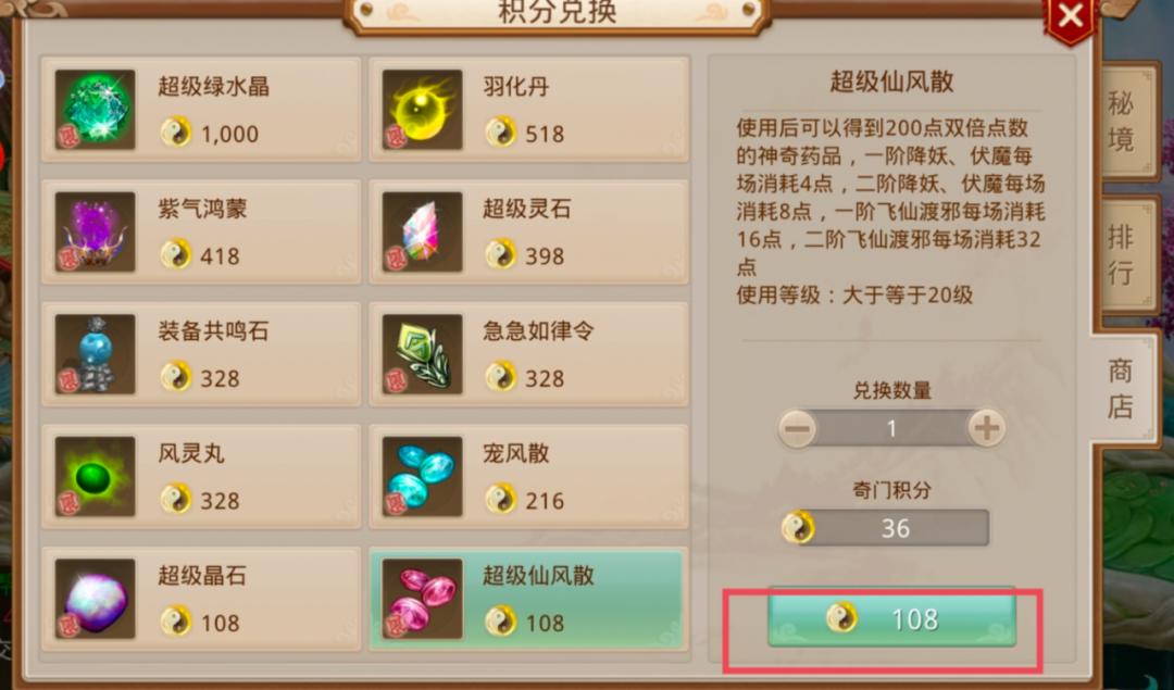 (8)优化奇门积分不足时,兑换道具页面的奇门积分不会显示为红色的问题;