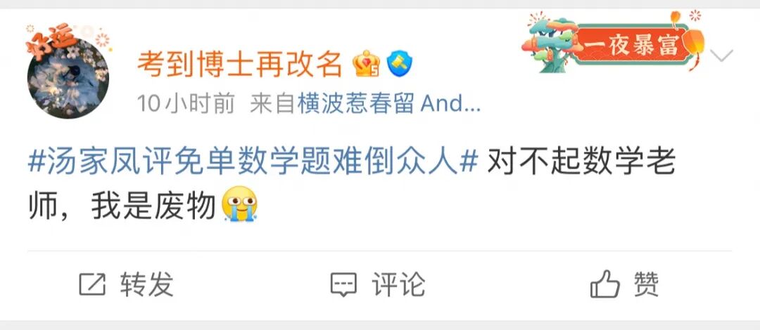前段时间作品刚刚荣获,“淘宝图什么图书奖”最佳睡前读物奖的汤家凤老师,连夜给广大网友出了一道题。此题一出,评论区一片哀嚎,有人甚至为此联系了十年没有联系的高中数学老师。但,汤家凤老师却坚持认为:“这分明就是一道送分题。”送不送分我不好评,但感谢汤家凤老师让我深刻明白了知识就是财富的道理。我本来想用通俗的大白话,给各位朋友讲一下这道题的解题思路,最后却发现虽然每个字都认识,但连在一起就看不懂了。今天的第二道题,是一道甄学家友好题(先说好这是组委会那么认为的,不关我事):这道题更是重量级,因为解题思路过于刁钻,让看过《甄嬛传》和没看过《甄嬛传》的人都沉默了。谁能想到,本来已经在国产剧里配享太庙的经典角色大橘,又被人给拎出来,当成了最新的互联网热瓜:被一顿抽丝剥茧,上演了一场真正意义上的“疯狂新欺四”。也不知道是哪位甄学家,精准截了一张温太医的微妙表情:上面那张图之所以排第二,是因为有“大明王朝1566学家”(大概吧)连嘉靖都不放过:好好好,这难道是互联网上消失已久的流行语——躺着也中枪?虽然,确实也有网友在为大橘发声,但能不能换一个不那么搞笑的图:唉,说出来你可能不信,我是敲着木鱼看完这些野生段子的。由淘宝免单甄嬛题产生的这些段子,甚至还衍生出了一个新的热搜:要我说,评论区里的那些梗图和段子,足以当作素材,就着这波热度,拍一部单集平均时长两分半的短剧。总之,这道题在今天傍晚时候,仅凭一题之力,先后带着淘宝登顶了两次微博热搜:只要成功怀上了,那就是喜脉,不一定非得生下来。所以那些因为各种不幸没能生下来的宝宝,也属于喜脉。有网友辩称,你看这果郡王的孩子,也是爱新觉罗家的血脉,皇上喜提大侄子,怎么就不能喜呢。可能是这件事情过于出圈(毕竟,话题在热搜第一挂了好几个小时),题确实也难。就在几个小时前,加钱哥用自己的短视频账号上传了一段威胁建议我们增加免单红包金额的视频:听不懂粤语又不喜欢看字幕的朋友纷纷表示:他说了个啥?