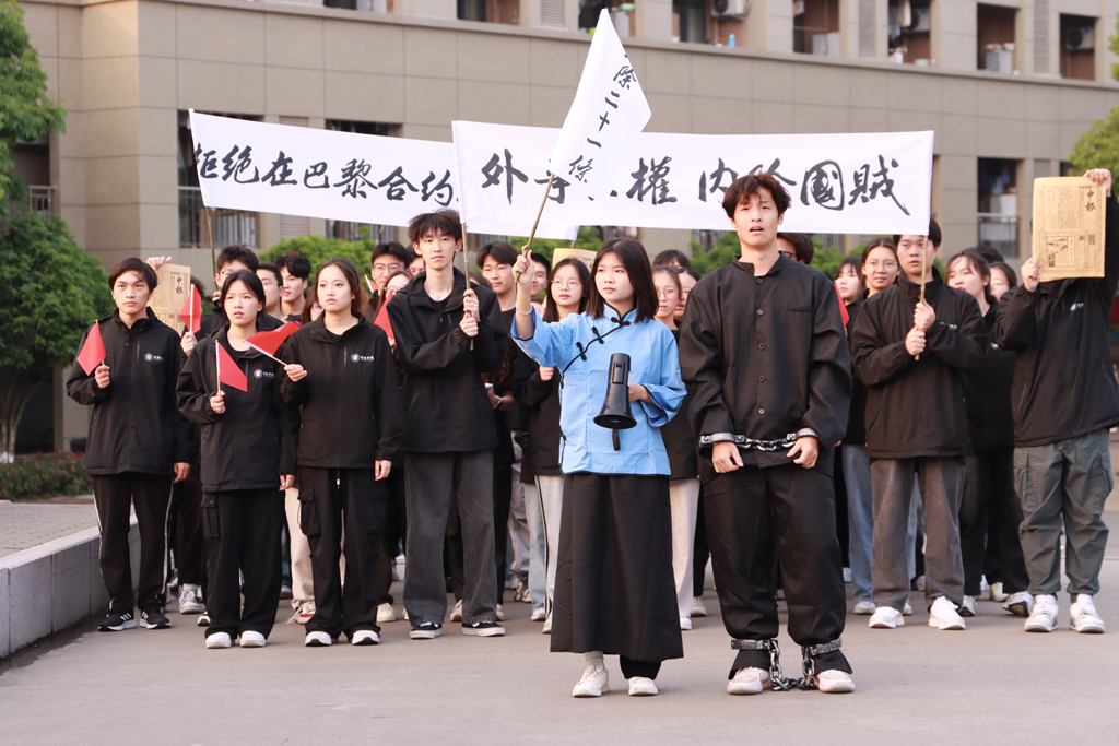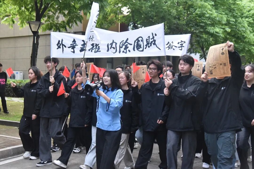 “红楼”“五四大街”“南池子”“东郊民巷”“外交部街”“赵家楼”——我校管理学院100余名学生日前把五四运动路线中的重要地点搬进校园,以剧情演绎方式纪念五四运动105周年,上了一堂“沉浸式”思政教育课。