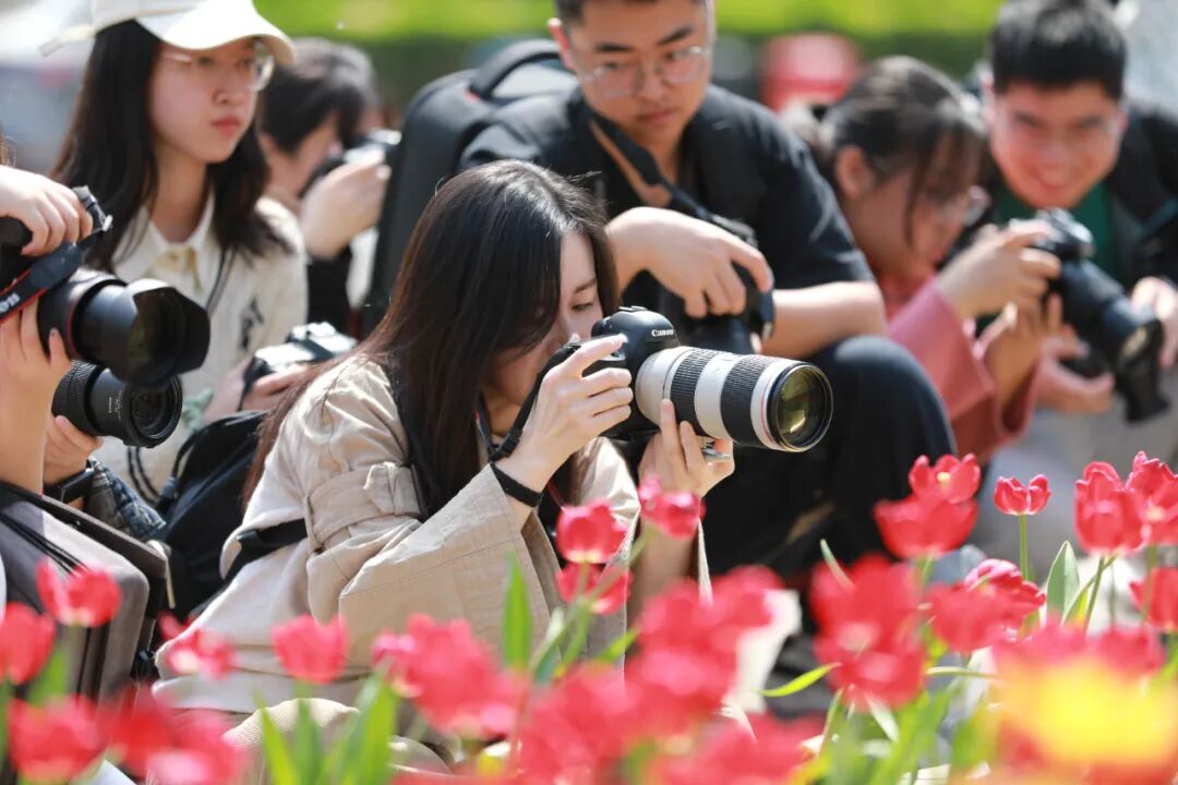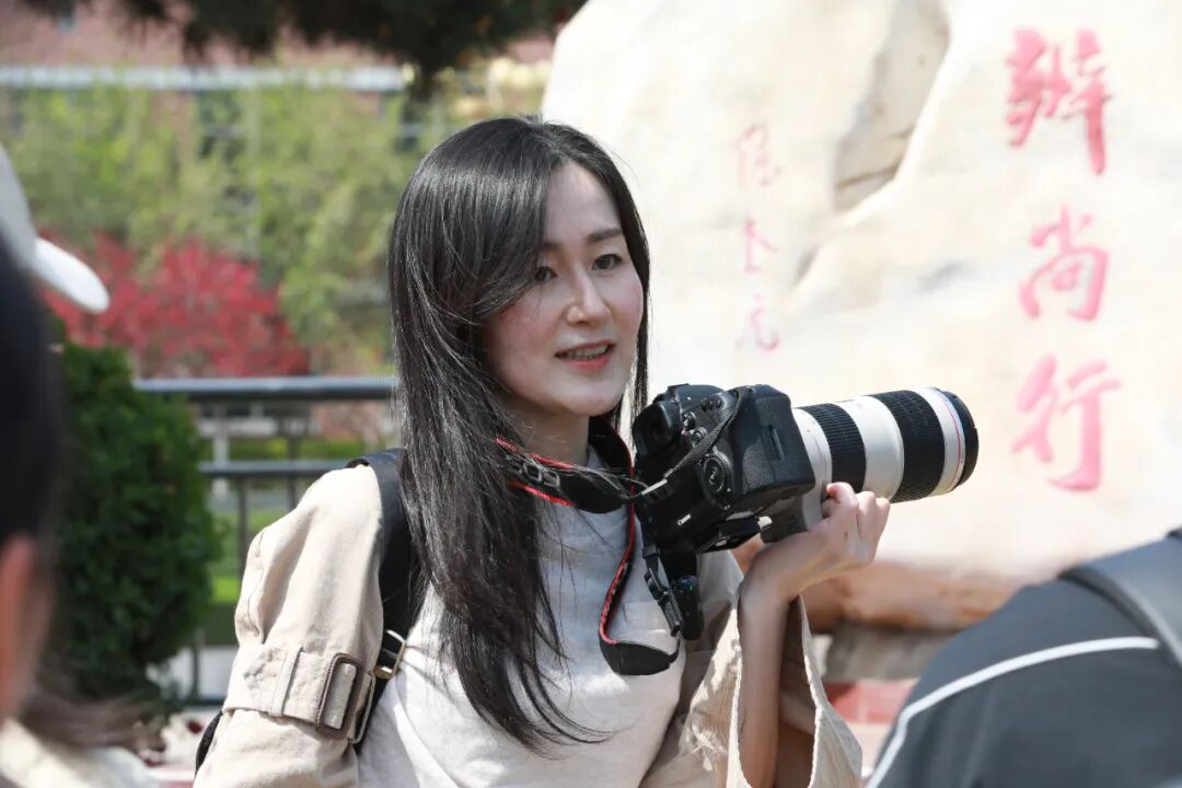 这节课,黄媛媛带领同学们拿起相机,走出教室,走进自然,用镜头记录下草木生长、人与自然互动的美好瞬间。黄媛媛在影像传播领域有着丰富的经验与深厚的造诣。除了教授“新闻摄影”,她也担任“影视剪辑”和“电视编辑”的任课教师。她的课堂,就像相机的镜头一样,将求知的目光汇聚其中,定格每一个灵动的瞬间,尽情展示着影像艺术之美。校园东门校训石前,郁金香正舒展着花瓣,沐浴着暖阳。