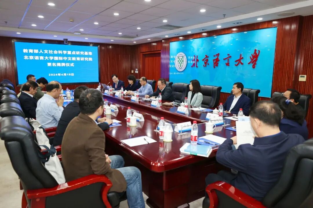 近日,教育部人文社会科学重点研究基地北京语言大学国际中文教育研究院更名揭牌仪式隆重举行,会议由基地主任、院长吴应辉主持。北京语言大学校长段鹏出席仪式并致辞、校党委副书记魏晖宣读教育部同意基地更名批复文件。出席本次仪式的还有世界汉语教学学会会长、全国汉语国际教育专业学位研究生教育指导委员会副主任委员、天津师范大学前校长钟英华,北京语言大学国际中文教育资深学者刘珣先生,北京师范大学国际中文教育学院党委书记、全国汉语国际教育教指委委员王学松,全国汉语国际教育教指委委员、北京师范大学教授宋继华,中央民族大学国际教育学院院长陈天序,北京外国语大学科研处处长张天伟,新疆师范大学国际文化交流学院院长邓新、副院长李敬欢、教授郭卫东,浙江师范大学国际文化与社会发展学院院长王辉,以及北京语言大学党委常委、组织部部长张健教授,学校办公室主任李志坚,发展规划与学科建设办公室主任颜伟,科研处副处长金飞飞,语言科学院院长曹文,国际学生教育政策与评价研究院院长王佶旻,汉学与中国学学院常务副院长(主持日常工作)李萍,国际中文学院党委书记梁彦民、院长沈庶英,应用中文学院院长苏英霞,教师教育学院院长施家炜、教授杨玉玲。参会本次会议的还有国际中文教育研究院教师及在读博士、硕士研究生。