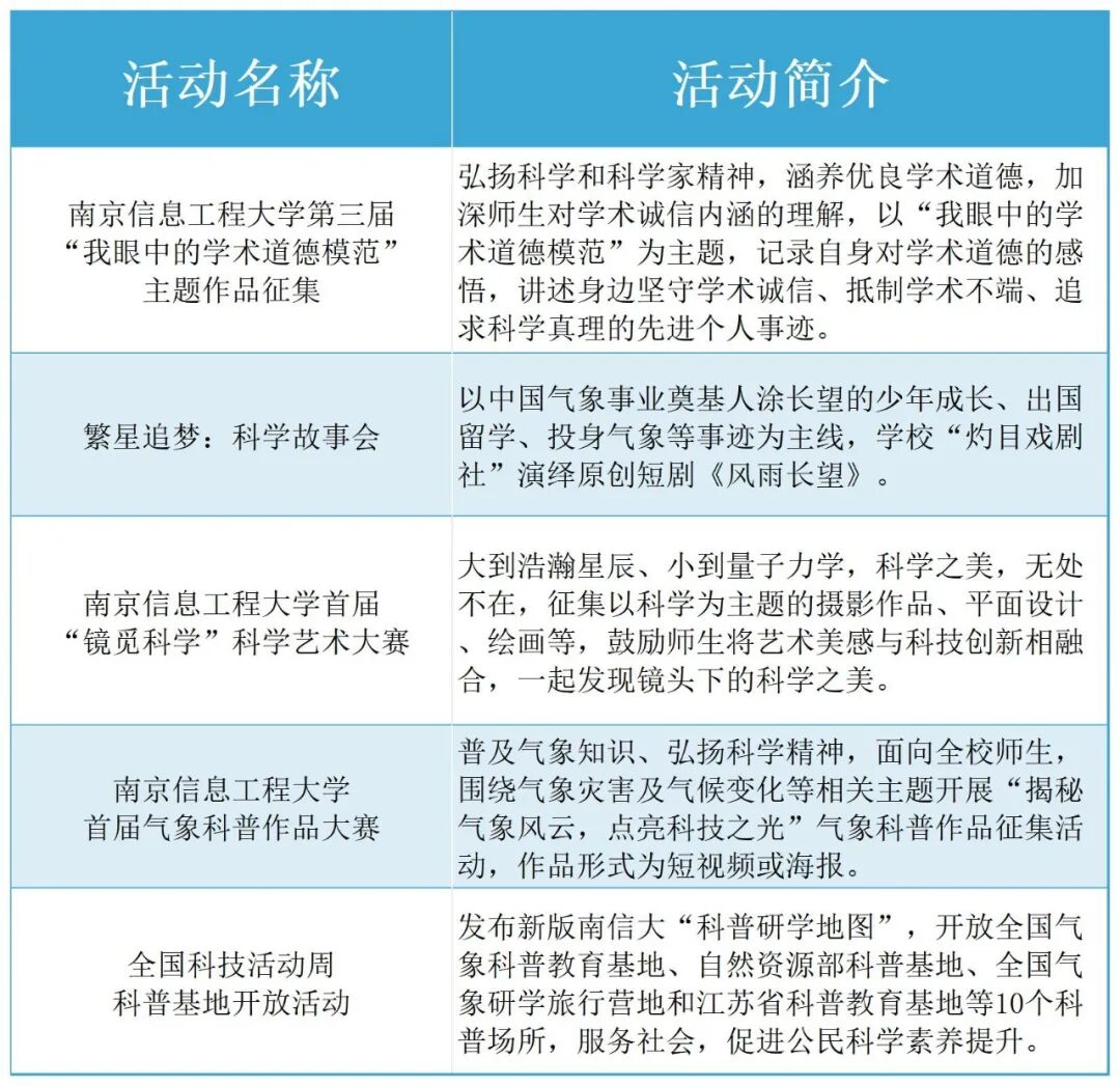科技成果展将于5月10日开展,展期20天。在大学生活动中心一楼、尚贤楼南侧广场、各学院教科楼大厅,19个学院展出150余件科技成果,呈现学校和学院科技发展、代表性科技成果、重点科研平台等,层次丰富、内容多元,打造超燃沉浸式科技徜徉体验。学术报告会将组织在校青年教师和研究生进行学术交锋,开展首届青年科技论坛、第十届研究生人文知识竞赛、“北辰星”学术论坛、笃行论坛、“朋辈领航,研途有道”学术沙龙等,分为大气科学、生态环境、信息通信、人工智能四个主题,从不同的角度展开研讨报告,为我校青年师生搭建学术交流平台。南京信息工程大学首届“青年科技论坛”,将于5月8日-5月17日举行,150余位青年科技人才做汇报,包括大气科学、地理遥感、信息科学、电子通信、数理化材等专场。为表彰在学校科技创新活动中涌现出的先进典型和作出突出贡献的青年科技工作者,激发广大青年科技工作者的科技创新活力,将在五月开展第二届“青年科技之星”评选活动。南京信息工程大学“青年科技之星”主要奖励在我校自然科学领域取得优异成绩的优秀青年科技工作者。为提升学校教师申报各类科技奖项的能力,分享科技奖申报经验,邀请国家科技奖励、省部级科技奖励获得者,交流成果培育和奖励申报的工作经验。![]()