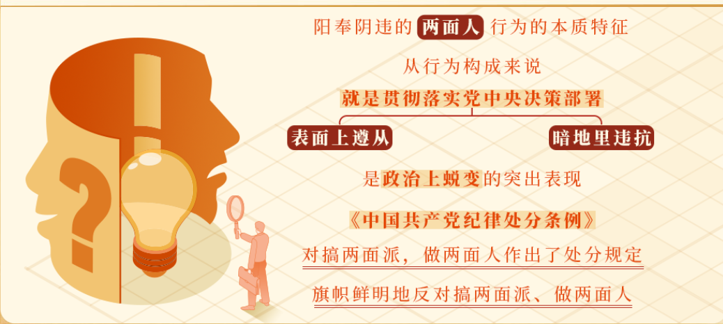 阳奉阴违的两面人行为的本质特征,从行为构成来说,就是贯彻落实党中央决策部署表面上遵从,暗地里违抗,是政治上蜕变的突出表现。