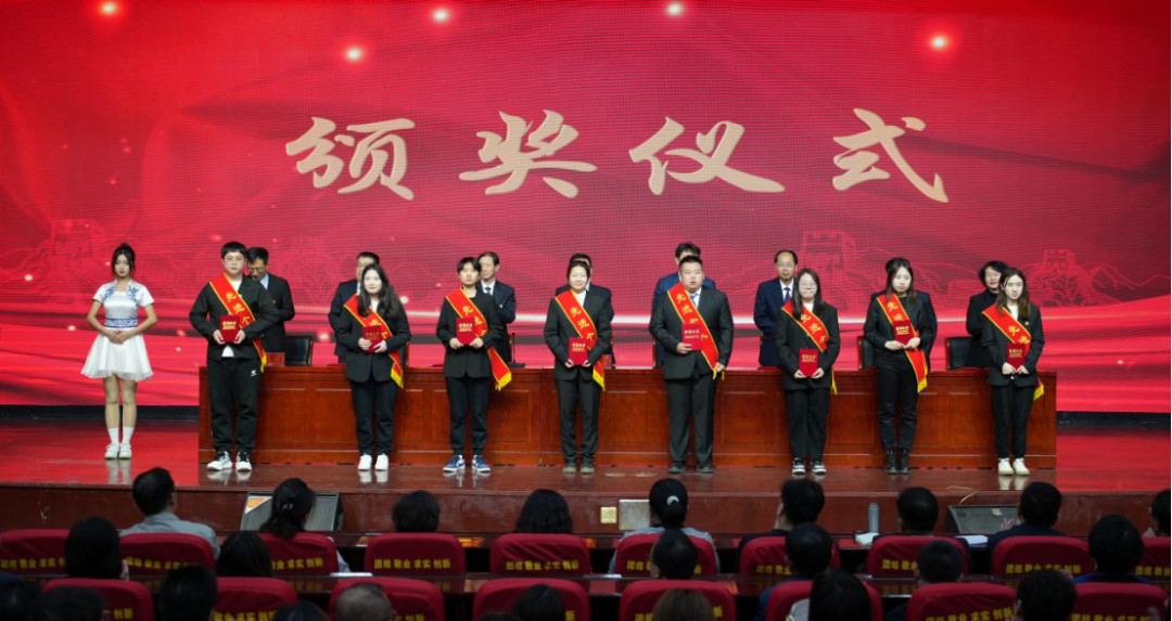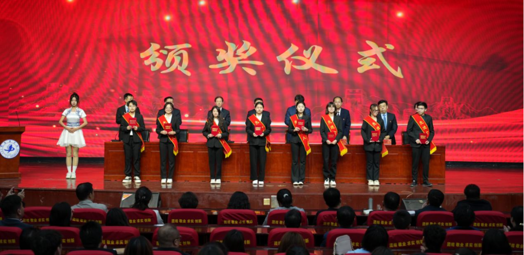 “先进团支部”“先进班集体”“大学生优秀社团”“大学生优秀科技创新团队”“共青团工作目标实绩考核优秀单位”代表上台领奖