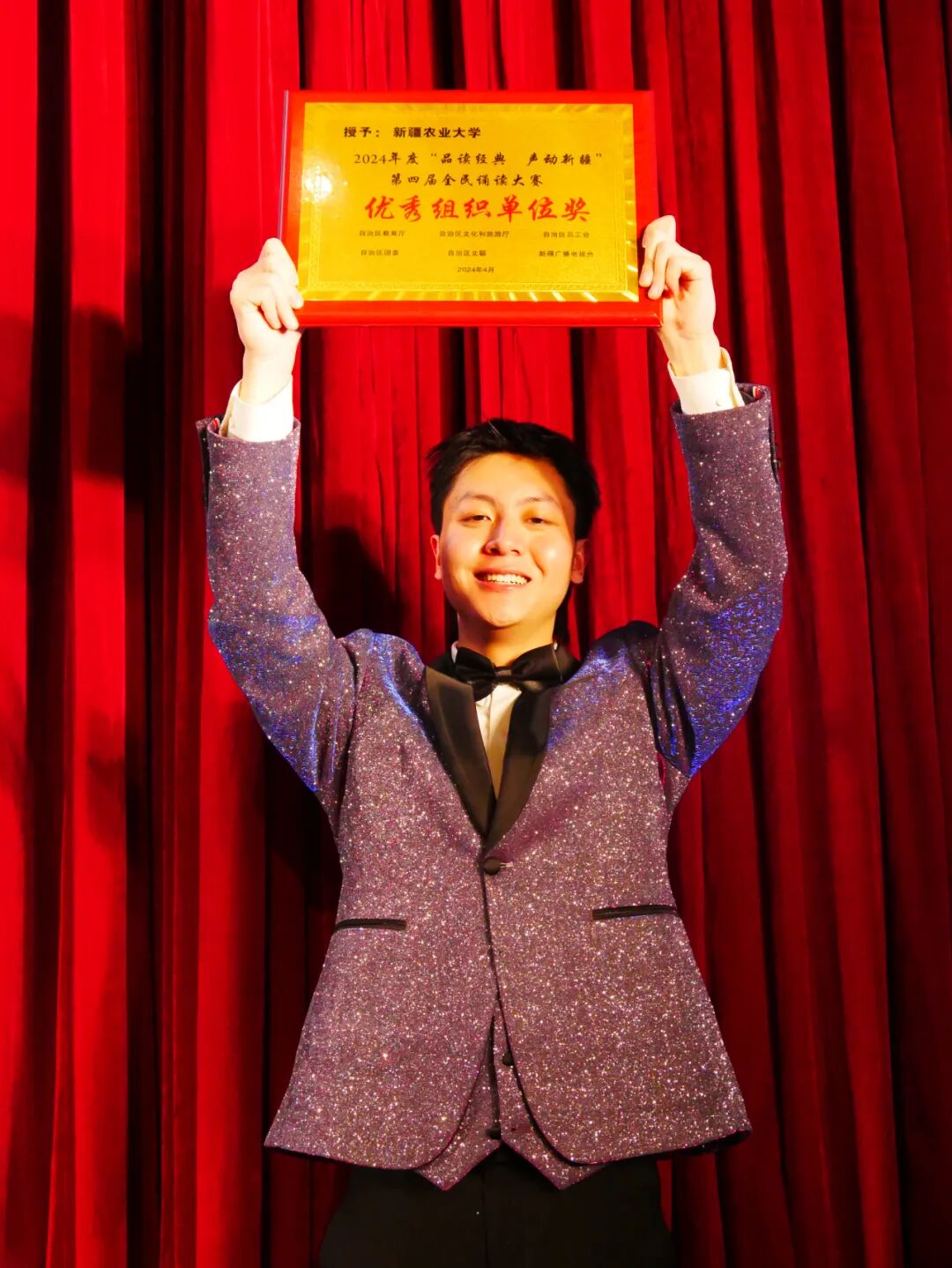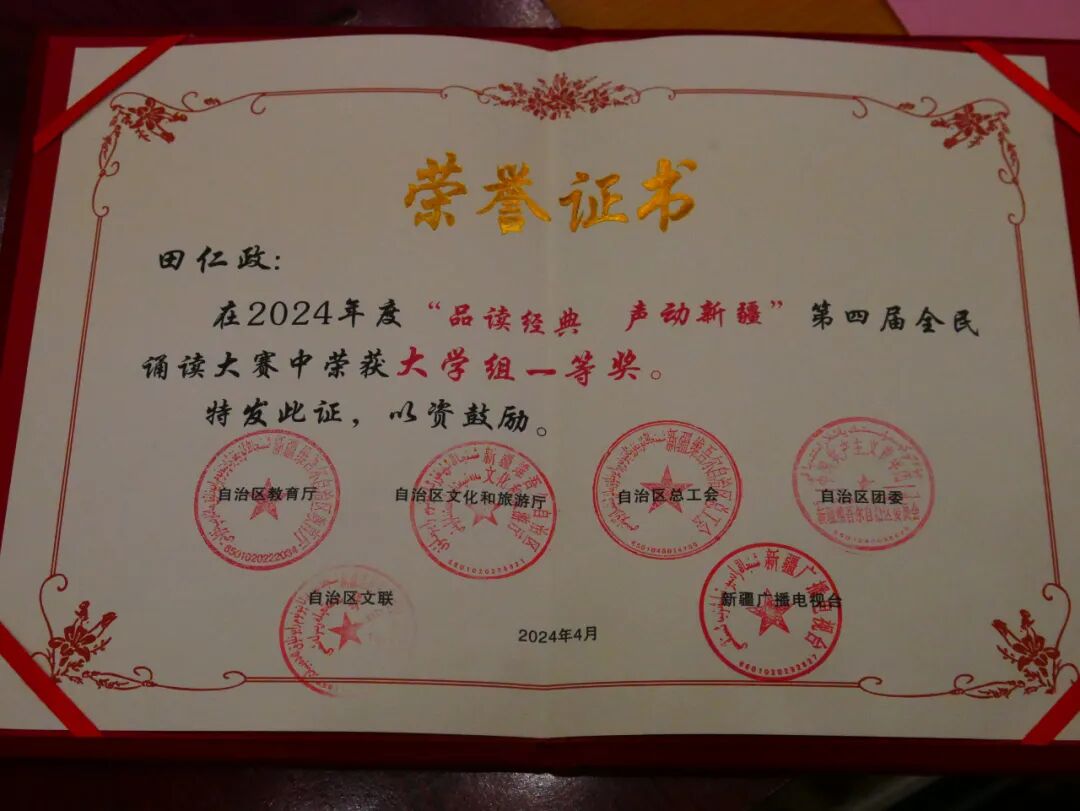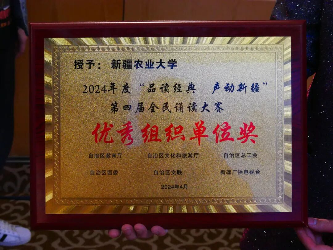近日,由自治区教育厅、自治区文化和旅游厅等单位联合举办的第四届“品读经典声动新疆”全民诵读大赛颁奖典礼在新疆图书馆举办。新疆农业大学广播站成员、机电工程学院电气工程及其自动化2103班田仁政同学的作品《妈妈,我要回家》经多轮角逐,最终获得自治区大学生组一等奖。新疆农业大学荣获优秀组织奖。
