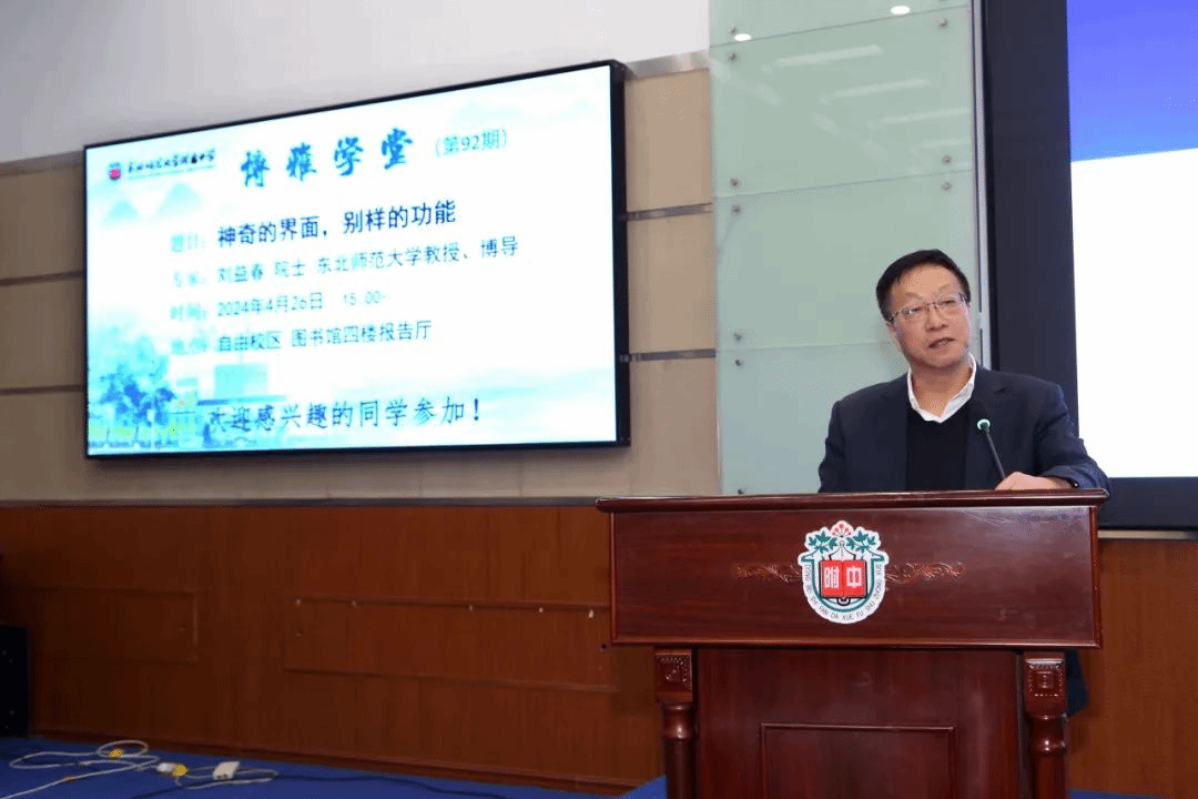 活动中,刘益春以“神奇的界面,别样的功能”为题为同学们作主题报告。他从历史上可以被称之为“科技之光”的前沿物理学家讲起,激励同学们努力学习,期待着未来中国将成为世界科技的最中心。接着,刘益春介绍了超疏水材料、光子晶体等新型材料的起源及发展;重点讲解了类脑型信息存储、新型类脑忆阻器以及氧化物忆阻器类脑功能的仿生模拟与艾宾浩斯遗忘曲线的结合与神经突触仿生模拟高级认知功能;深入浅出地讲述了高密度全息光存储,并向同学们展示了全息图像的感知与存储。