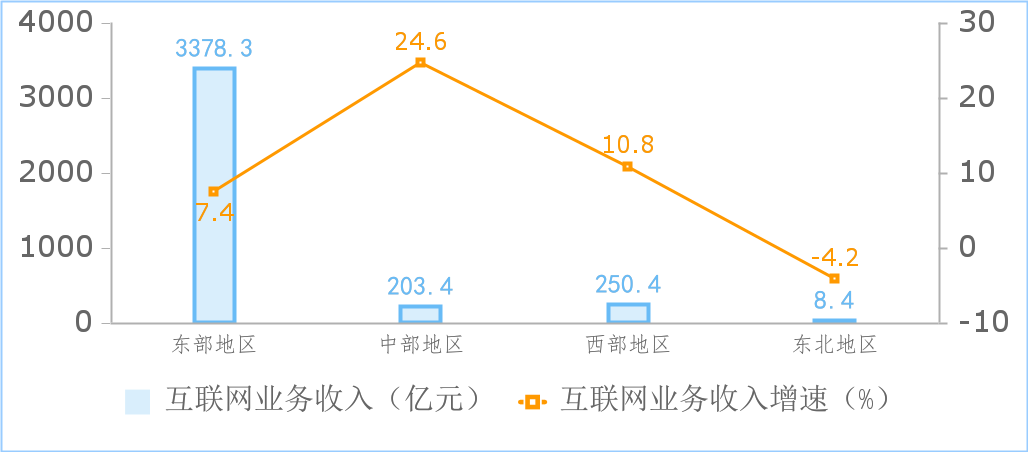 中部地区互联网业务收入增速领先,东北地区收入降幅收窄。一季度,东部地区完成互联网业务收入3378亿元,同比增长7.4%,低于全国增速1个百分点,占全国互联网业务收入的88%。中部地区完成互联网业务收入203.4亿元,同比增长24.6%,高于全国增速16.2个百分点。西部地区完成互联网业务收入250.4亿元,同比增长10.8%,高于全国增速2.4个百分点。东北地区完成互联网业务收入8.38亿元,同比下降4.2%,低于全国增速12.6个百分点。