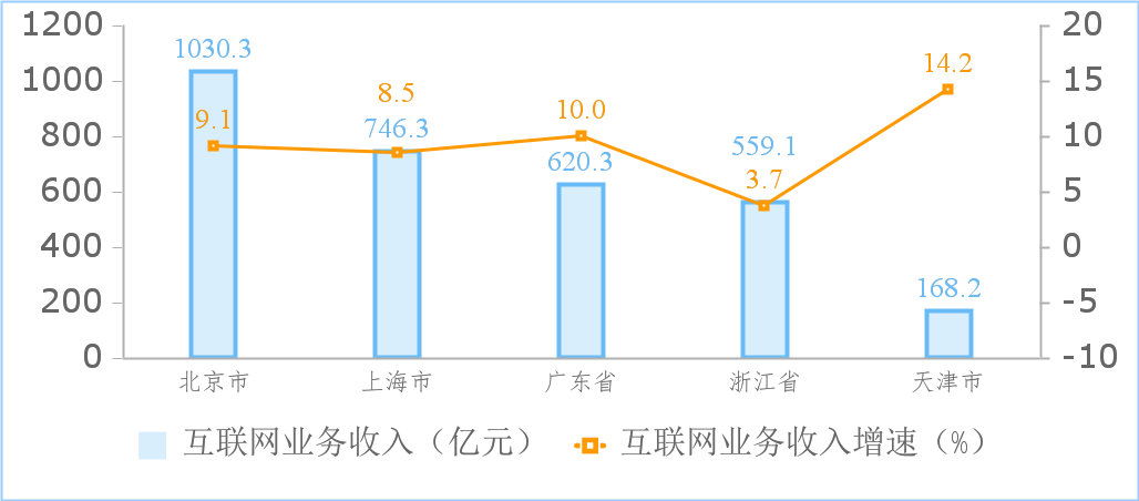 超半数地区互联网业务增速实现正增长。一季度,互联网业务累计收入居前5名的北京(增长9.1%)、上海(增长8.5%)、广东(增长10%)、浙江(增长3.7%)和天津(增长14.2%)共完成业务收入3124亿元,同比增长8.4%,占全国(扣除跨地区企业)互联网业务收入的81.4%。全国互联网业务增速实现正增长的省(区、市)有16个,其中甘肃、安徽增速超50%,新疆、广西降幅超40%。