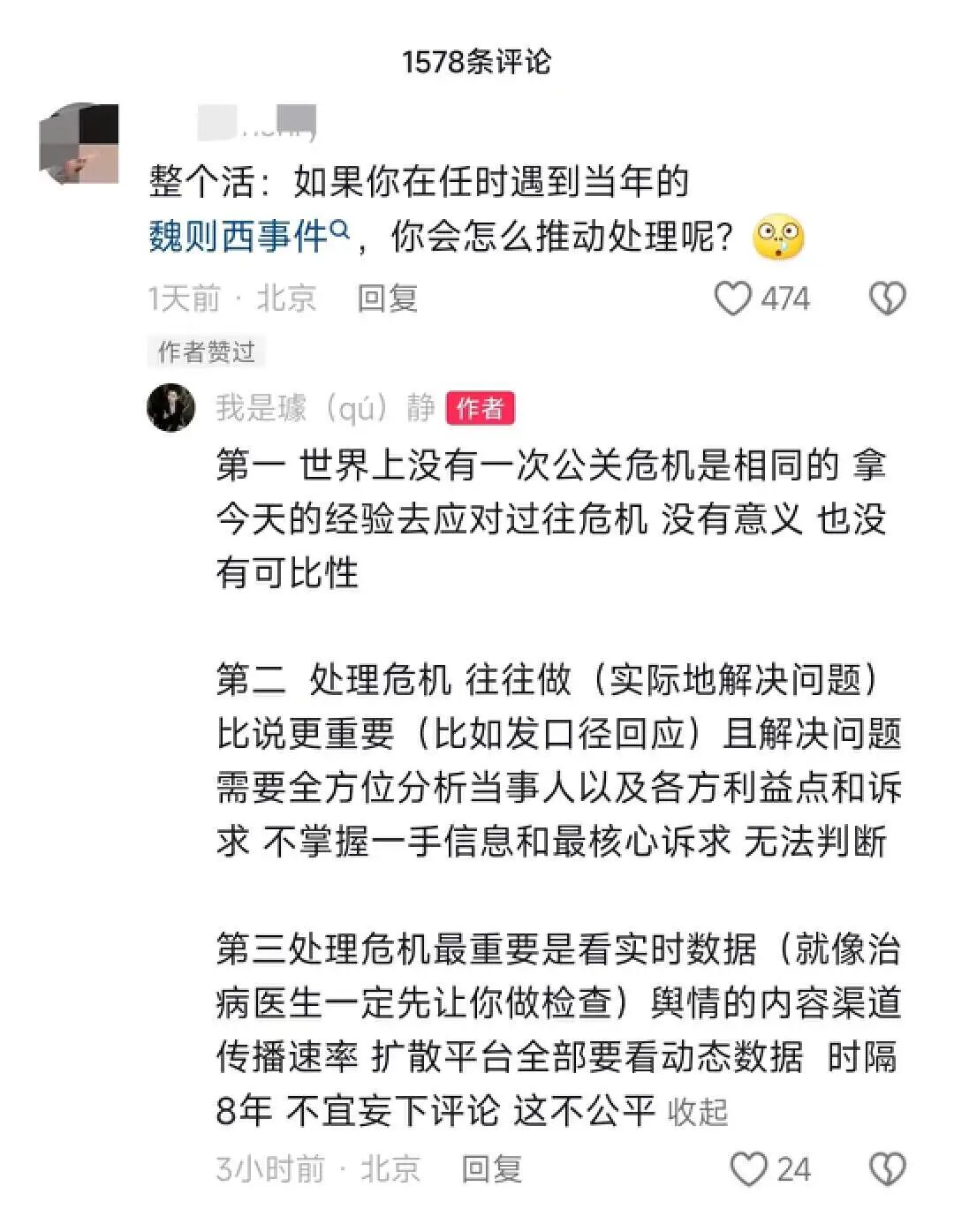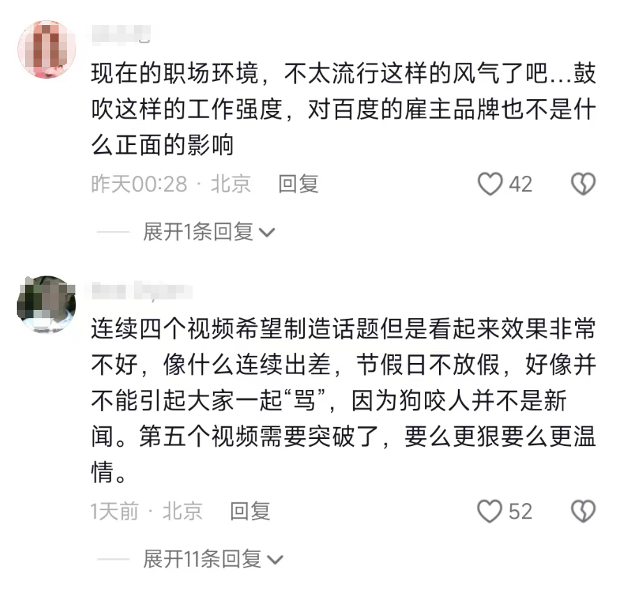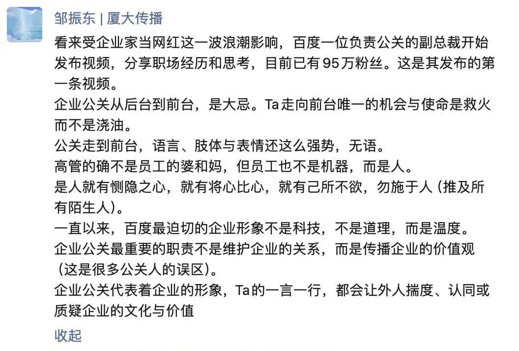 这些犀利言论让璩静的第一条视频就获赞超5000,还登上了微博热搜,相关话题累计播放量破亿。有人从员工角度出发,认为璩静“情商差了点”“没有人文关怀的公司没有存在意义”;有人从公司角度出发,认为“这种价值观营造出来的氛围不一定是和谐的氛围”。有负面评论也有正面评论。不少网友留言:“上过班的人应该都知道这种公事公办的领导有多难得”,“跟着她也简单,给一分钱干一份活就行”。此后,璩静相继发布多条视频,内容涵盖打工人、女性、职场等多个热门话题。视频中,璩静大多短发,黑衣,语速极快,一派女性职场精英的形象。为了工作,她表示没有休过年假,手机24小时开机,随传随到,晚上一两点睡觉,早上六七点起床;面对职场,她表示如果有人试图通过非法手段对她进行人身诽谤,她有能力让对方在这个行业内失去工作机会。或许是为了缓和自己稍显冷酷的形象,璩静还曾在5月4日发布视频《谁挣钱多谁买单,副总裁不让员工买单》,表示自己经常送下属非常好的礼物,包括手机、奢侈品包等,同时强调不会让员工送礼物,外出聚餐时也不需要员工抢着买单。但或许是其它视频用力过猛,璩静遭受的负面反馈愈演愈烈。甚至有网友认为:“百度的公关一号位,将亲手创造百度的公关危机。”5月7日,#百度副总裁5天涨粉百万账号系购买#等相关话题登上微博热搜。当天,“我是璩(qú)静”的账号内容被清空,百度公关一号位做网红的尝试暂时告一段落。为什么璩静下场做个人IP,最终以删除全部视频告终?第一,话题本身可能存在问题。作为一位资深大厂高管,璩静发表的观点或许在某些场景下有其合理性,但当这些观点出现在抖音这个公共场域内,就显得过于冷酷,不够亲民,显得傲慢。璩静下场做网红,用的身份是百度公关一号位而非个人,说话的对象是公众而非员工,这注定了有些话题是有争议的。有业内人士认为,璩静的视频,如果是商业培训讲师、女性成长博主来说,已经可以用来卖课了,但璩静自己说却有引发公关危机的风险。查看璩静的账号评论区可以发现,数量最多的评论是认为璩静“有窒息感”,觉得百度“没有人情味儿”。事情发酵后,不少自媒体开始批评璩静的观点,乃至质疑百度的价值观。第二,抖音账号粉丝来源存在疑问。因为被怀疑并不是靠5条视频涨粉近百万,而是直接购买或者改头换面了一个原本拥有90多万粉丝的老账号,不少网友批评璩静“走捷径”“不诚实”。此前,已有多家媒体引用新榜旗下抖音数据工具新抖统计分析,2024年之前,“我是璩(qú)静”这个账号发布的内容大多是服装种草类内容,直到2024年5月1日,在清空之前的内容后,“我是璩(qú)静”开始发布璩静本人相关内容。此外,早在2022年,该账号的粉丝数就接近百万。5月1日璩静开始在这个账号发布内容时,该账号的粉丝数为94万。第三,璩静的公关身份未必适合出镜做网红。有业内人士认为,璩静作为百度公关一号位,不适合出镜,公关的工作价值是不让外界感受到公司有公关,公关亲自出镜,各种行为格外容易被放大。公关和媒体的密切关系让璩静几乎是在放大镜下做事,小争议很容易变成大舆情。璩静之所以在5月7日中午将账号内容清空,很难说和大批媒体迅速跟进报道、相关负面话题登上微博热搜无关。不少业内人士认为,企业老板做个人IP才是最佳选择。微博CEO“来去之间”评价,百度已经意识到企业拥有自己的自媒体矩阵的重要性,这种反应速度已经超过了很多公司,“奈何公司高管不愿意出台,只能辛苦公关部大干快上”。在我看来,百度做个人IP这件事,更多是技术问题,而非方向问题。买号“换头”被诟病,那就从零开始做个新号,主打养成系;公关一号位身份不合适,那就寻找更合适的高管;璩静被扒出不少真假未知的负面传闻,公众好感度堪忧,那就换个公众好感度更高的人;至于璩静最受诟病的“职场大女主”人设,也更像是网友的喜好问题,而非触碰底线的原则性问题。有网友推测,璩静将个人账号和百度强绑定的行为,大概率得到了百度甚至是李彦宏本人的同意。在内容行业,有争议才有流量。以璩静的经验,大概率考虑过自己发的内容会引起怎样的争议。据新浪科技报道,早在今年3月,璩静便要求百度公关部全员转型做视频自媒体,员工的视频号表现影响当年年终绩效。据了解,璩静做抖音是为了给其他同事打样。此前璩静还在内部鼓励其他高管做个人IP。个人猜测,璩静的原定计划是先用争议话题做流量起盘,最后再转变风格,用温和内容逐渐“洗白”。这种黑红式的起号玩法并不少见,不少网红都曾靠争议话题成功起号。事实上,有争议从来不是问题,问题是如何面对争议。《Are You OK》最开始是对雷军的恶意吐槽,周鸿祎因为最近的二手车拍卖遭到不少调侃。但目前来看,两人收获的社交反馈以正面居多。对璩静来说,核心问题是舆情的变化超出了她的预期,她或许没意识到企业身份比纯粹的个人身份更加复杂。当负面反馈过多时,璩静只能先将账号内容清空,控制负面舆情的进一步发酵。璩静的“暂时失败”能证明企业不应该打造个人IP,将老板、高管、员工培养成有流量、有人设、有公众好感的网红吗?老板之外,小米、极氪、阿维塔等企业的的高管团队纷纷开通个人账号。因为网友“你甘心被雷总压一头吗”的玩梗,小米高管卢伟冰、王腾得到了