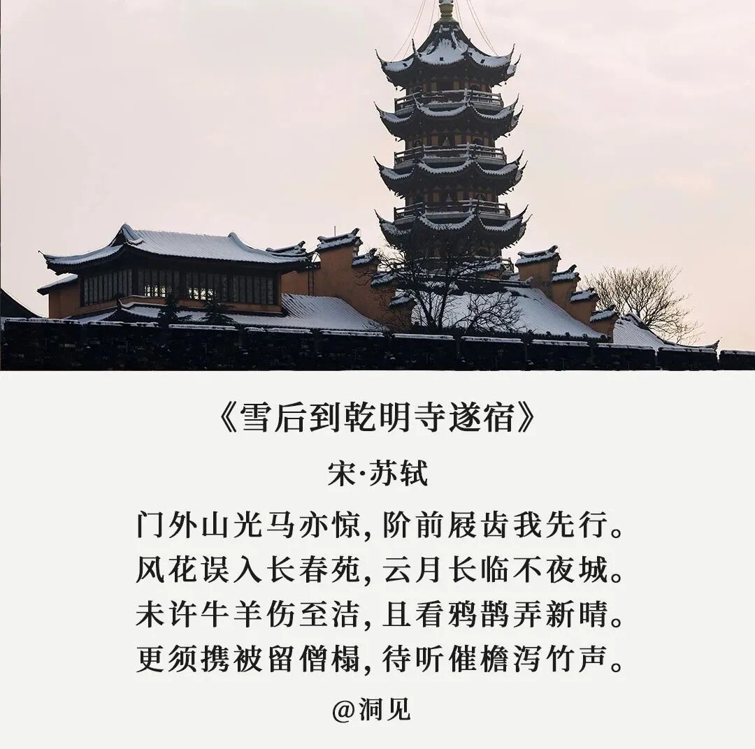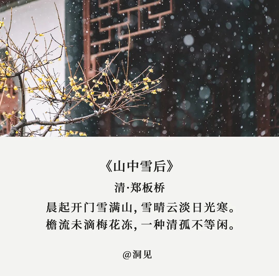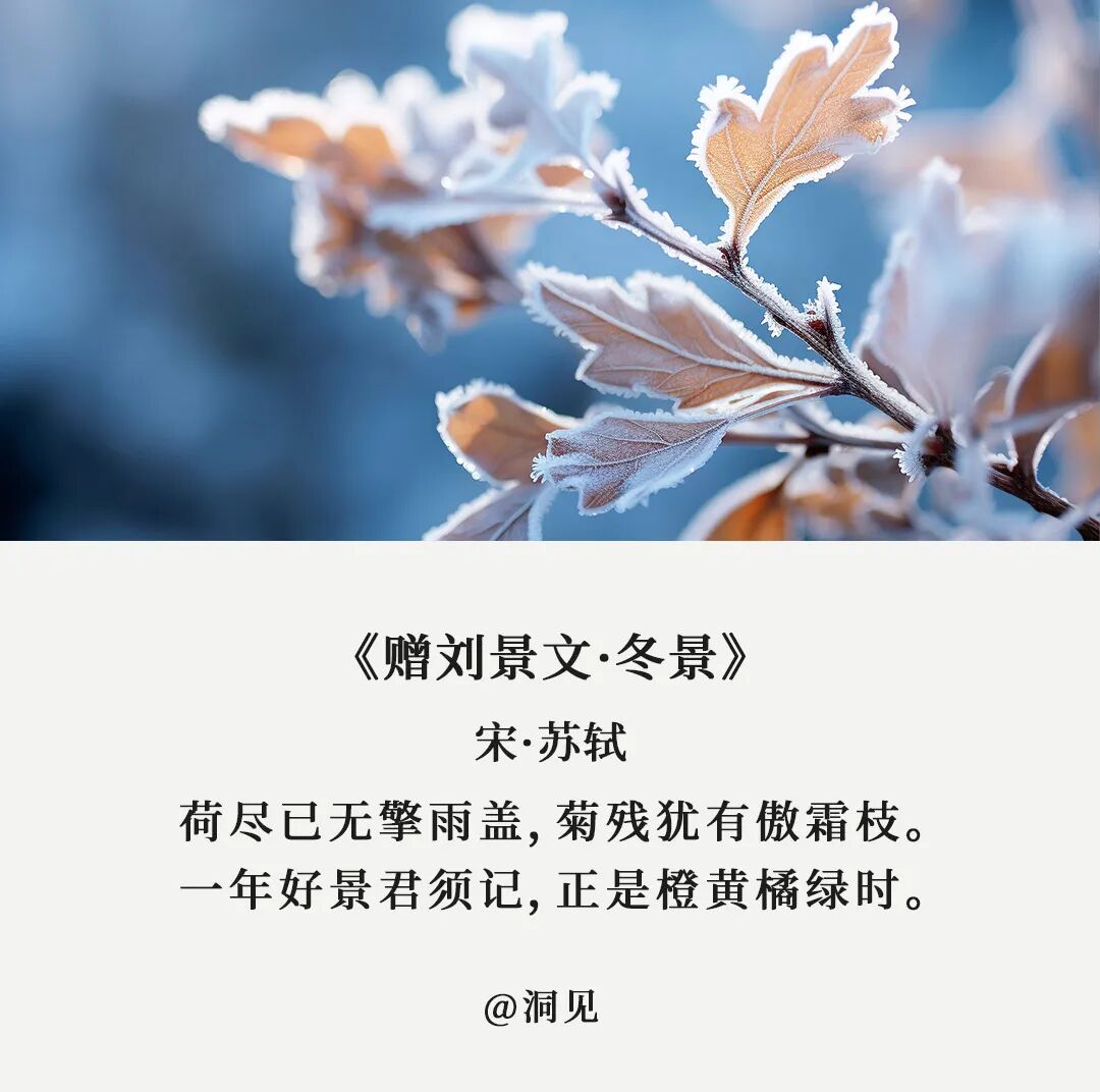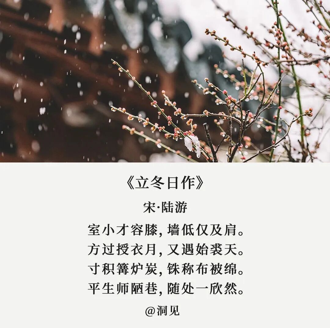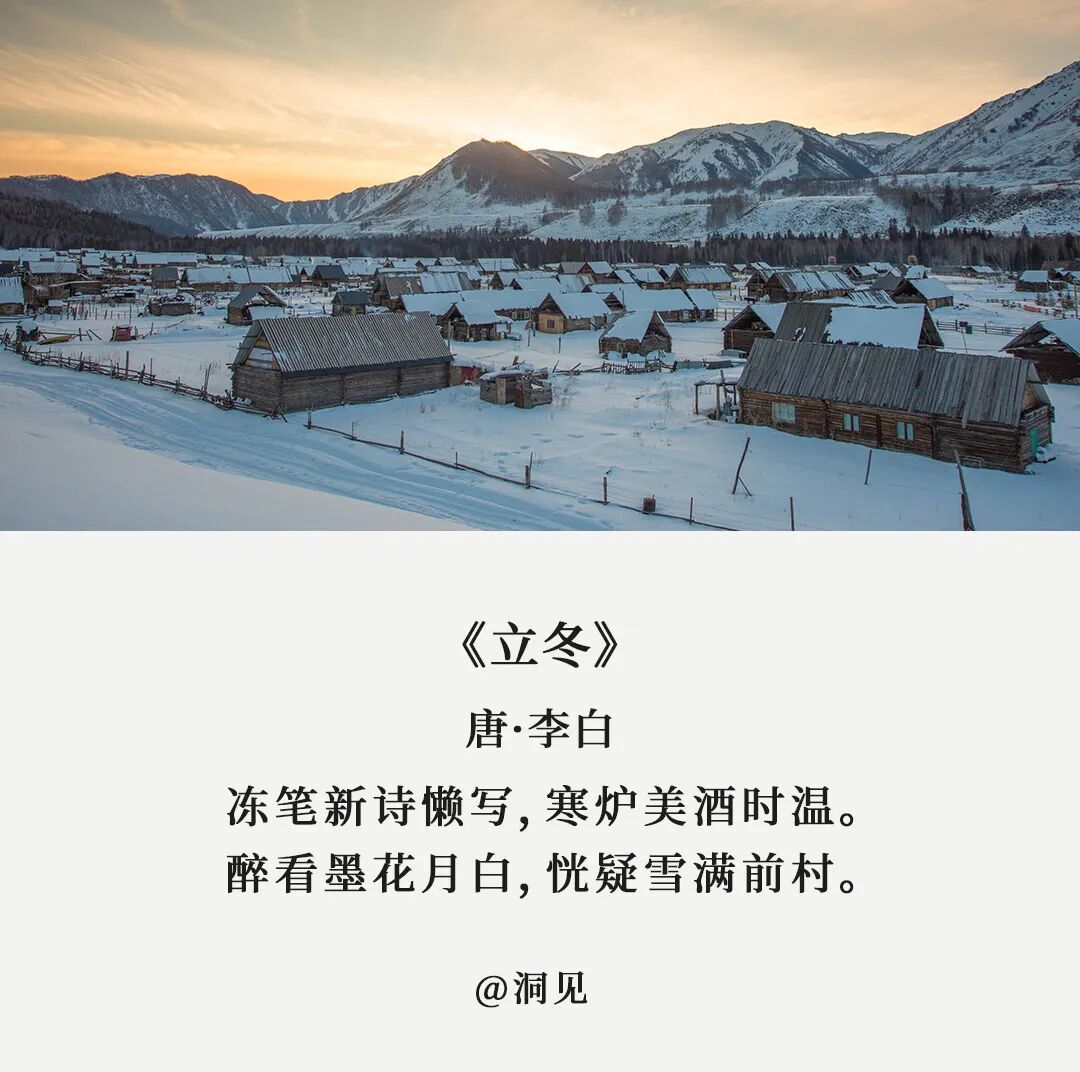 《月令七十二候集解》记载:立,建始也。冬,终也,万物收藏也。可也正是因为冬日的寒冷,身边那些温暖才显得弥足珍贵。就像古人这7首诗词,写透了冬日的温情与美好,穿越过千百年的时光,给我们以力量与温暖。北宋诗人刘景文本是将门之后,却仕途坎坷,58岁时还是个八品都监,时常感叹此生无所作为。以此劝勉刘景文,虽然青春流逝,可这也正是人生成熟、大有可为阶段。切莫意志消沉,妄自菲薄。其实,苏轼这时也已步入暮年,这首诗又何尝不是用于自勉。四十年为官路,三十载贬谪途,苏轼这一生不是被贬,就是在被贬的路上。绍圣四年,62岁的苏轼被贬儋州,政敌都以为苏轼这次必定一蹶不振。可苏轼从不因为年老迟暮而放弃,他在这里办学堂,介学风,以致许多人不远千里,追至儋州,很多人会在冬日到来,岁末年近时产生懈怠、摆烂的念头,心里想着:算了吧,一年又快到头了,明年再努力。可是,你已经咬牙坚持了这么久,难道要在本该冲刺的时刻选择放弃吗?人生在世,但求日进,不因年纪而妄自菲薄,不因岁末而意志消沉。路再难,走下去,不荒废、不焦急,总会有不期而遇的温暖和生生不息的希望。陆游一生命途多舛,晚年清贫,却活到了85岁,皆因乐观豁达。寒冷的冬日,陆游家徒四壁,衣单食薄,炭不足温,被不足暖。但物质的匮乏,丝毫没有影响他的心情,反而即兴写下:平生师陋巷,随处一欣然。生活可以拒绝给你豪宅珍馐,却不会拒绝给你清风,明月,和内心的安宁。宠辱不惊,闲看庭前花开花落;去留无意,漫观天外云卷云舒。换一种角度,换一种心态,万般境遇到头来,可作书读,可当诗吟。公元八一五年,白居易被贬为江州司马,此次被贬,对他来说如坠寒冬。幸好,有刘十九这位患难相扶的挚友,每日陪他作诗下棋,共渡难关。他准备好新酿的米酒、把火炉烧得通红,还特意邀请老友刘十九。这一句轻言细语的问候,就足以让人在冰天雪地中感受到温暖和安慰。假如你也有知冷暖,共患难的朋友,何不像白居易一样,在冬日的夜晚,燃一炉火,温一壶酒,静静等待他的到来?一千三百年前的一个立冬之夜,李白入睡时灵光乍现,诗兴大发。望着屋外一地白霜恍如雪景,李白索性躺平不写,悠闲地温上一壶小酒对景独酌。古时称冬日为冬闲,忙碌了大半年,冬天终于可以闲下来好好休息。也只有闲下来,仔细感受,才会发现生活中的美好与惊喜。在闲暇中滋养自己,哪怕天寒地冻,也能把琐碎的日子过得有情有趣。何夜无月?何冬无雪?只是少有像李白那样闲情逸致的人罢了。漫漫冬日里,学会让自己心安理得地享受一份闲暇,也是人生很重要的功课。但他却凭着强大的耐力,熬过那段苦寒的岁月,彻底扭转了自己人生的僵局。就如同这《山中雪后》,冬日肃杀,却仍有一枝梅花傲立。熬过了冬天,你才能穿过眼前灰白的世界,邂逅明媚的春光。永远乐观,心向光明,才能在这个薄情的世界里,深情的活着。高适和董庭兰相识于微末,时隔多年终于再会,却来不及唏嘘,转眼又要各奔东西。高适却安慰董庭兰:莫愁前路无知己,天下谁人不识君。人活于世,对于绝大多数人来说,都和高适、董庭兰一般,是风雪中的赶路人。因为偶尔的相遇摩擦,融化了彼此肩头的雪花,而后又将因为彼此的方向不同,再次让霜雪覆满肩头。但人事并非我们想象中那样苍凉,我们路过可以依偎,分开也会由衷祝愿。就像高适说的那样:莫愁前路无知己,天下谁人不识君。别把离别说得那么伤感,分别只是暂时的离开,一切过往皆为序章。分别的日子里,愿彼此安好;看不见的时光中,愿各自顺遂。漫山白雪银光照眼,整个乾明寺就像是一座不夜城,不再有人来人往,只有喳喳欢鸣的鸟雀。苏轼被这雪后美景瞬间吸引了,甚至还想要携着被褥留宿于此。但透过字里行间,你看得到他赏雪的欣喜,却丝毫感觉不到他不得志的苦闷。可在最失意的时刻,苏轼笔下流露的,也从来不是哀哀戚戚的抱怨,而是始终如一的豁达。如果遇上风雨,他就索性竹杖芒鞋,踏雨归去;如果遭遇暴雪,他就静待大雪过后,抬头看天。而你的心态和格局,将决定这困境会让你自暴自弃,还是绝地反击。人生就是在冬夜中冒雪前行,没有谁能轻松地抵达终点。但不管眼下的日子有多寒冷,有多难熬,都请你坚信,等到这场大雪过后,一定会看到最美的风景。千百年前,这些诗人都经历过寒冬,可他们从未被寒冬打倒。因为历经风霜仍有梅花傲雪,熬过寒冬必将迎来春回大地。点个在看,愿2023年冬天,朋友们被温暖环绕,人间值得。请长按下方图片