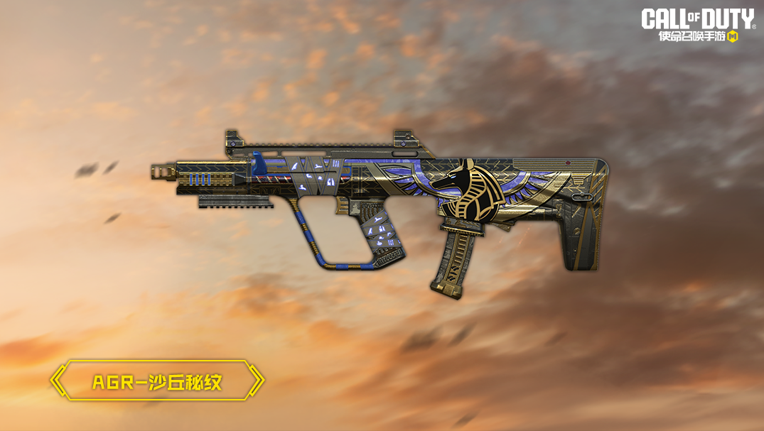 AGR-沙丘秘纹的枪身布满设计精美的纹饰,像一件精美的工艺品。缠绕的绷带上星罗密布的排布着神秘蓝色铭文。握把上方的阿努比斯雕刻栩栩如生,仿佛已经掌控了敌人的宿命!