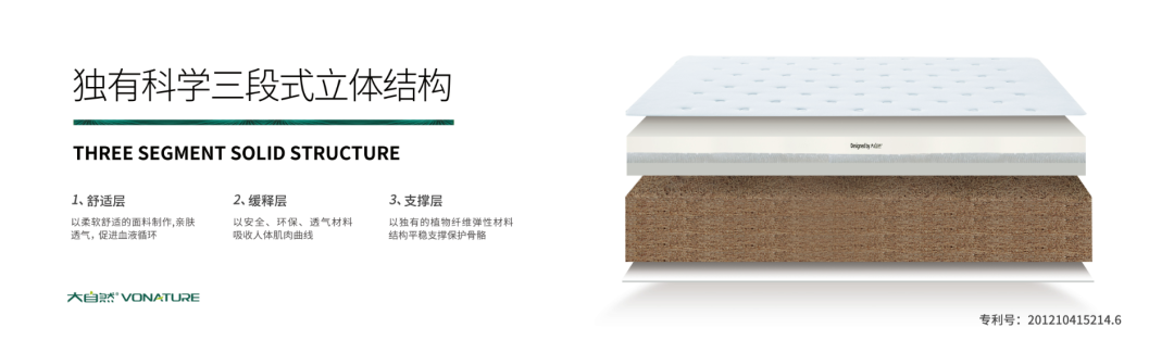 大自然针对亚洲人身体特点研究出健康睡眠床垫的科学结构:三段式立体结构,更加符合中国人的脊椎生长和体型,适用不同年龄,身高,体重,体型和睡姿的人群,专业护理脊椎、腰椎和颈椎!