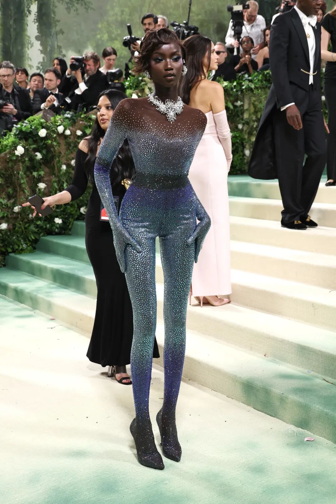 这个连体衣造型来自 Swarovski 的定制,整个造型运用多达 98000 颗施华洛世奇水晶打造,看着很像夜色下波光粼粼的湖水,在这次 Met Gala 的红毯上倒也显得和谐。