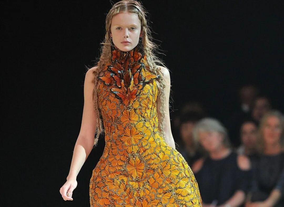 这件极为梦幻的裙装里,以类似灯箱的形式,将新鲜植物,多彩花卉、飞舞蝴蝶去囊括其中,打造了一件生机勃勃的穿着艺术品。