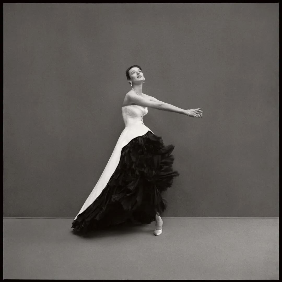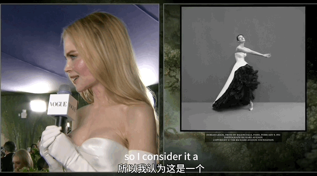 来自于 BALENCIAGA 的特别定制,其灵感来源于 Cristóbal Balenciaga 1951 年的高定礼服。白色胸衣和黑色团簇裙拼凑在一起,十足的老派好莱坞风格。