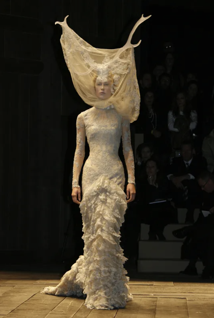 这件礼服其实是致敬了 Alexander McQueen 2006 秋冬的那件著名的“鹿角”礼服。