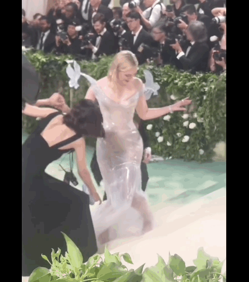 造型确实要给个大高分,不过现实情况有点好玩,因为这条裙子材质的原因,她直接在红毯上丧失了行走能力,需要保安们把她一点点抬上楼梯。