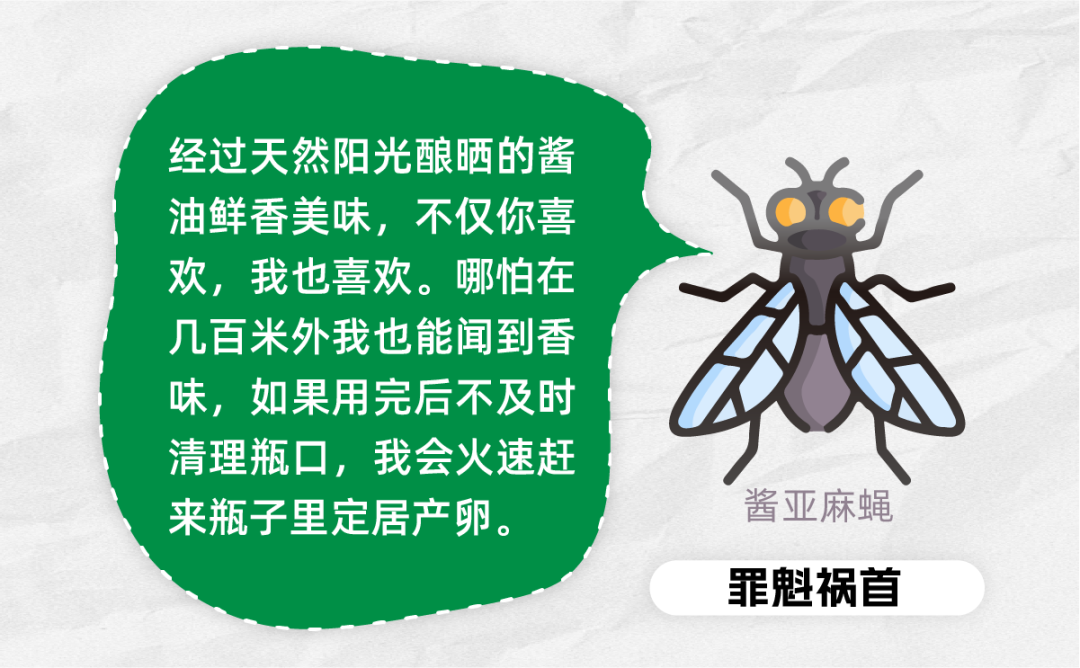 有一种叫酱亚麻蝇的昆虫,尤其喜爱香味浓郁、蛋白质和氨基酸含量高的食物,所以经过天然阳光酿晒的酱油等鲜美的调料,就成了它们的“快乐天堂”。如果瓶盖没盖好,在夏季湿热的环境下,特别容易吸引卵胎生的酱亚麻蝇在瓶口里产虫,幼虫就会顺着瓶口爬进瓶里。