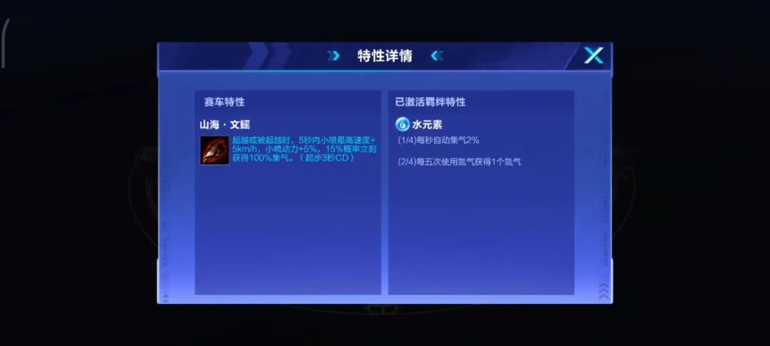赛车特性:(仅竞速赛生效)每5次漂移,7秒内氮气最高速度+5.8km/h;每6秒基础最高速度+0.4km/h(限8次);每3次使用氮气,氮气最高速度+1.2km/h(限5次);每次使用氮气3秒内每秒自动集气5%(仅道具赛生效)基础最高速度+3km/h,小喷最高速度+5km/h,小喷动力+5%,氮气动力+8%,氮气时长+1s。使用1次氮气后,效果翻倍超级ECU火力盛装:使用后获得1个小喷且7秒内氮气最高速度+10km/h。氮气状态中使用,短暂突破极限速度,下两次使用氮气获得2个小喷,4.5秒内获得175%集气。未处于氮气状态中使用,进入氮气状态。