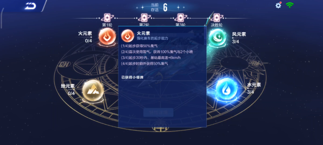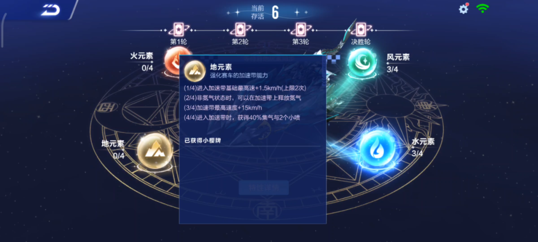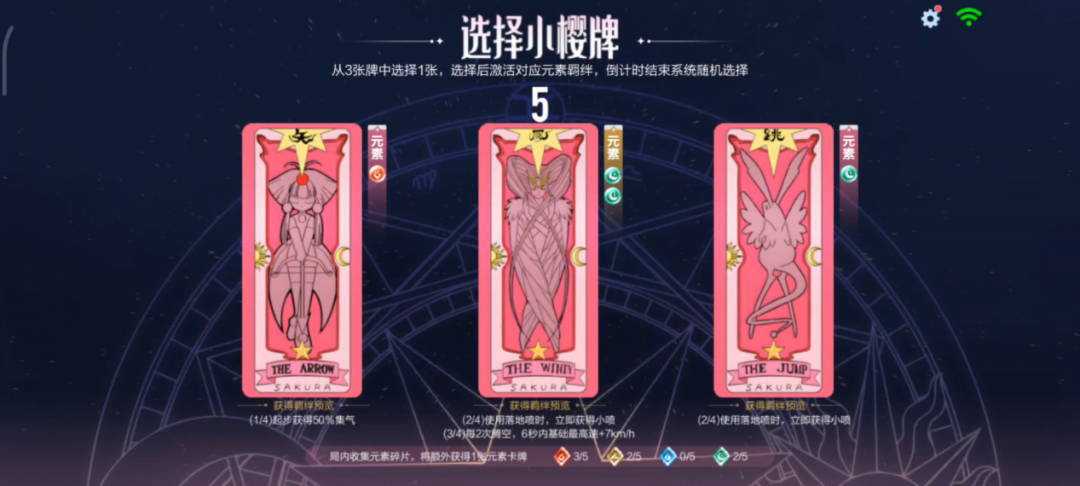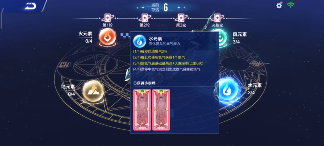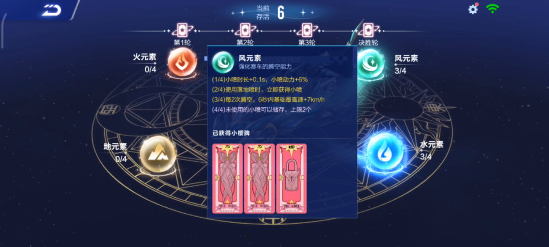 而不同的元素则对应了不同的加成,车手们可以根据加成来选择小樱牌,激活对应元素等级~