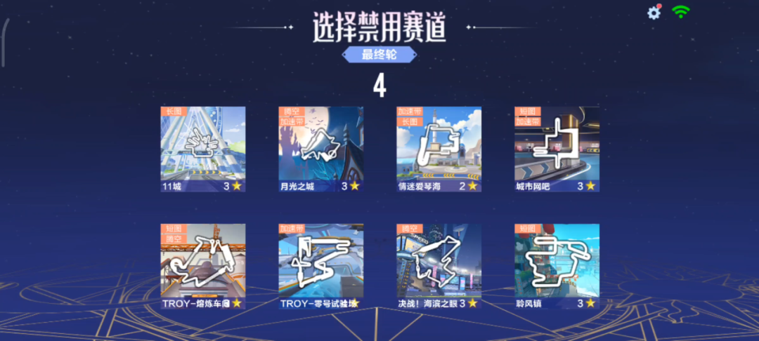 我们除了可以根据对赛道的熟悉程度来ban选赛道,也可以根据随机赛车的特性来ban选赛道(在ban选页面有超贴心的赛道星级标识)。
