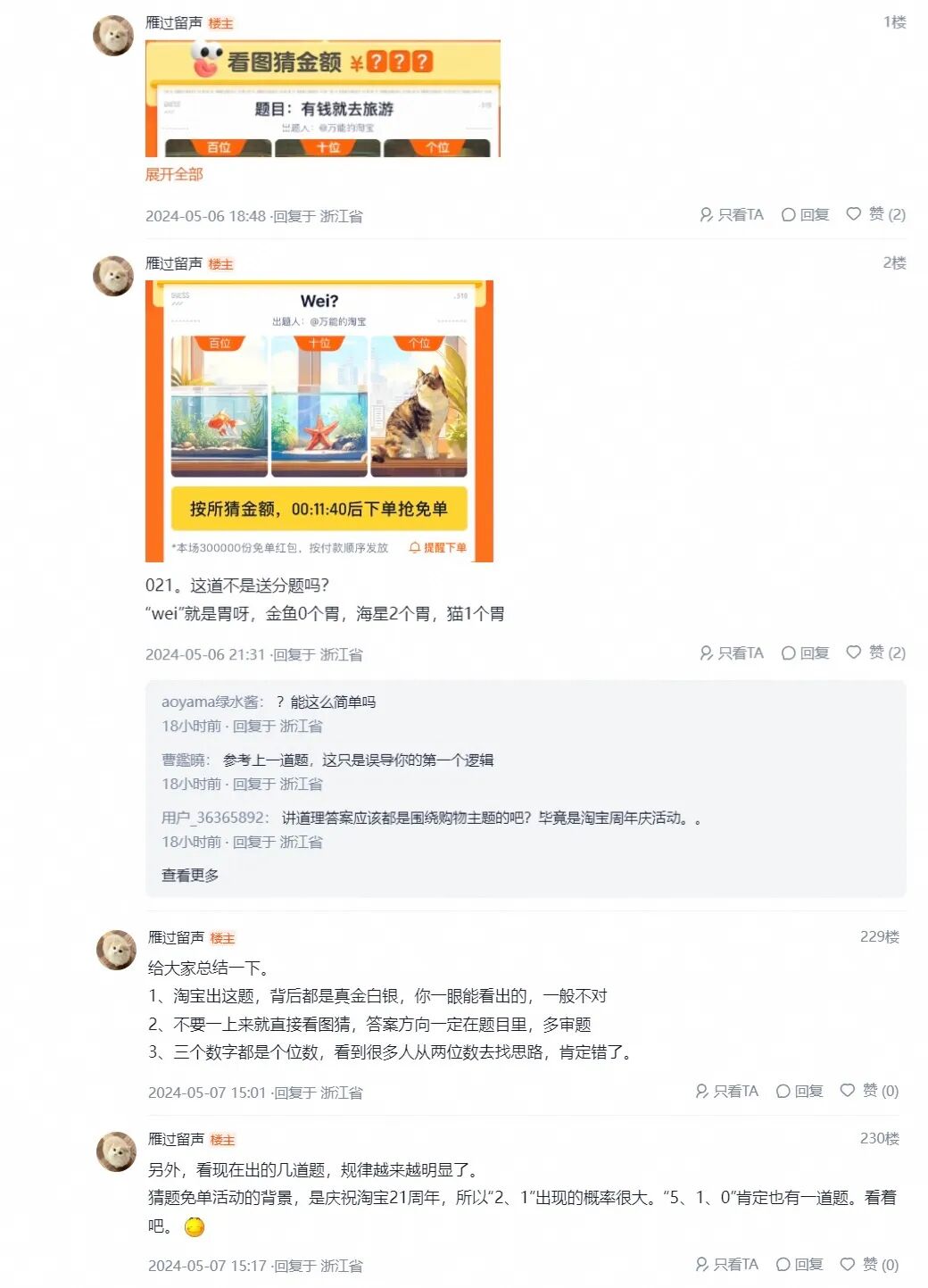 那么我们按照题干得出的谜面,即,郭靖的闻道顺序,可以得出以下几位指点郭靖的先后顺序:不得不说,六神磊磊确实是在世最强“金学家”,在微博上的分析完全吻合组委会的出题思路,思考方式确实刁钻!这几天,在我们刚刚重启的淘江湖论坛上,出现了一位真正的猜题大神,已经连续猜对了很多道题的答案:后面的题目遇到拿不准的,可以登录bbs.taobao.com看大神分析,当个参考。