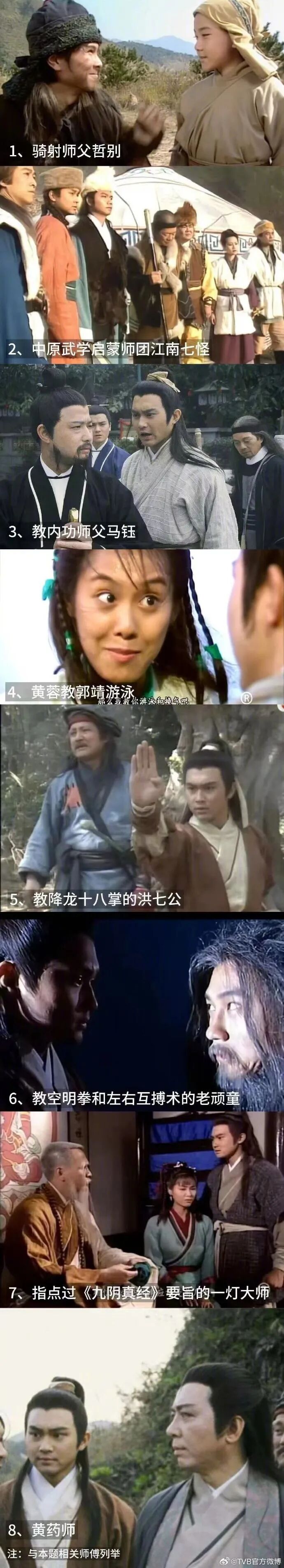金庸题没发完的免单预算,我们将加码并全部投入到下一个不用猜题的活动中,该给到的福利,一分都不能少!老规矩,先看题干:“←术业有专攻”。向左的箭头暗示真正的线索,其实是它的上一句话“闻道有先后”。闻道,圈重点,不一定要成为师徒关系才能被称为闻道,只要指点过的都能算。从“有先后”这3个字可以推导,这是一道关于“闻道”的顺序题。而出题方TVB又派出了黎耀祥老师给出了一个提示,即,题目中的图片和周伯通有关:那么就可以确定,最后一张郭靖练习左手方右手圆的经典画面,就是在暗示周伯通。同理,第一张一箭双雕的图,暗示的就是教过郭靖射箭的哲别。第二张图为郭靖第一次用亢龙有悔打断小树苗的画面,暗示的是教他降龙十八掌的洪七公。最后需要确定的,就是这三位指点郭靖的顺序,也就是郭靖闻道的顺序。哲别作为第一位指点郭靖的大师,基本上没有分歧,由此可得:第一个数字为“1”。昨天的争议主要围绕着:洪七公和周伯通到底是4和5,还是5和6展开。......黄蓉笑着将他扶起,教他换气划水的法门。......郭靖在明师指点之下,每日在溪水中浸得四五个时辰,七八日后已能在清溪中上下来去,浮沉自如。