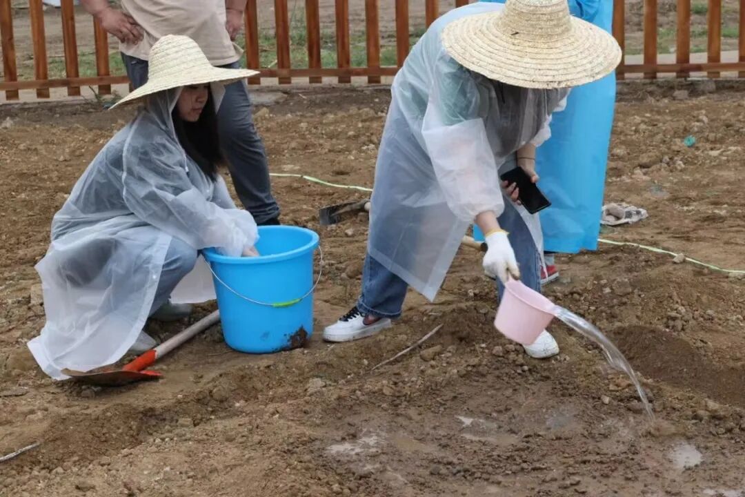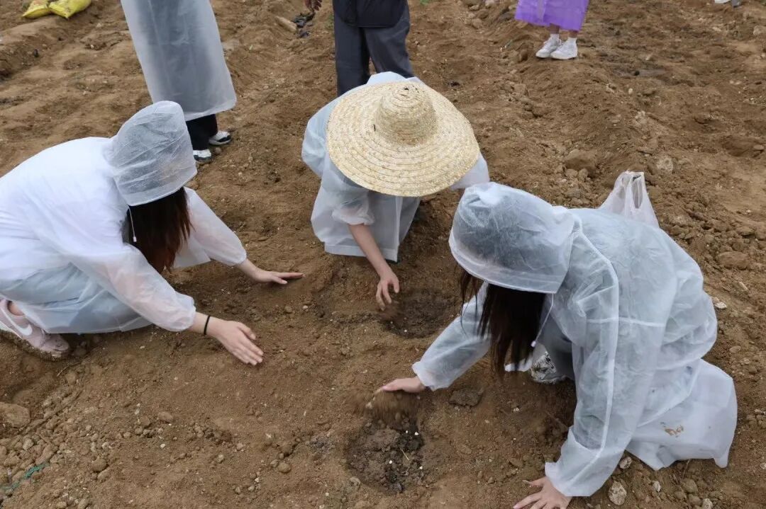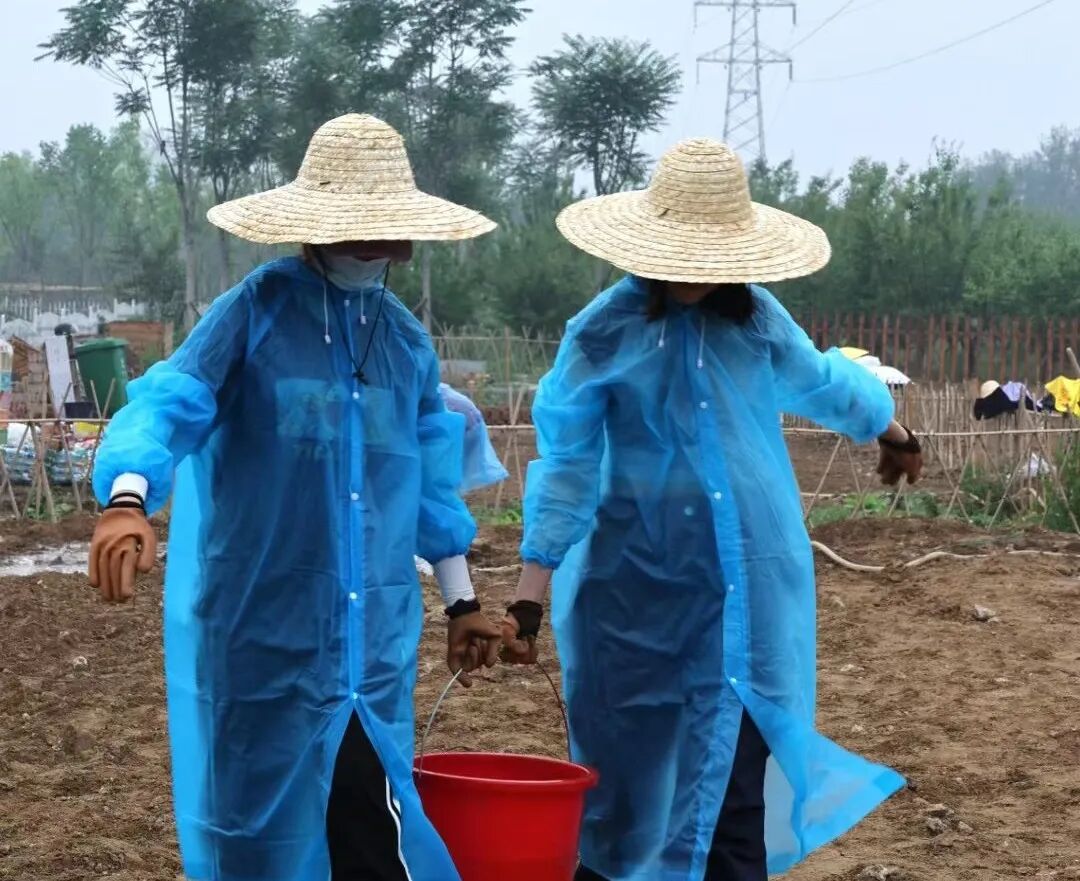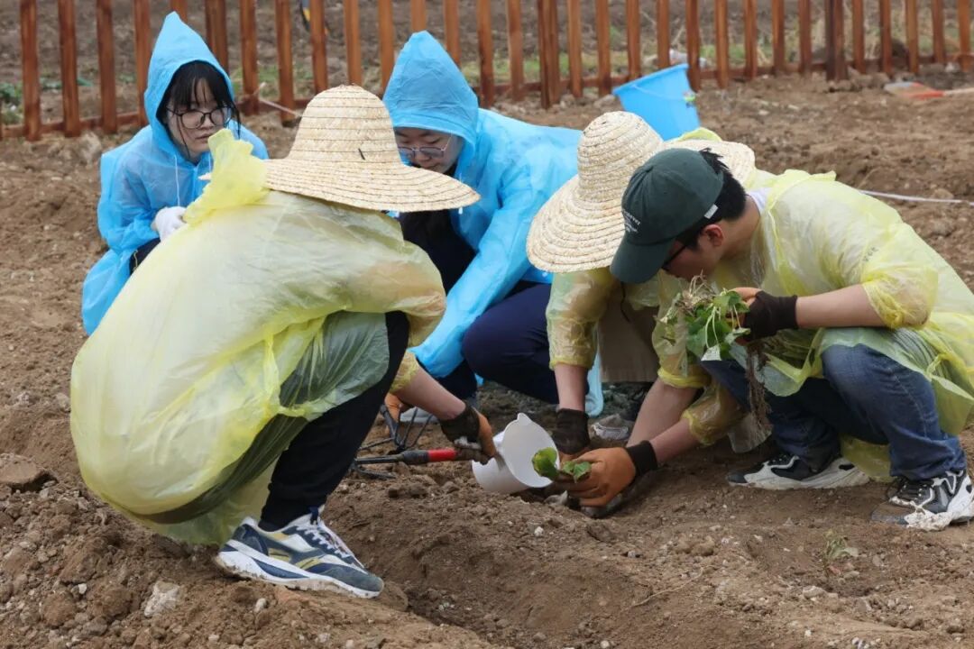 绵绵细雨难以浇灭同学们的满腔热情。在农业指导老师完成示范后,同学们身着雨衣、头戴草帽,在翻新过后的土地上劳作,大家各司其职,或松土,或犁地,或浇水,或施肥,或播种等,为土地增添了缕缕绿意。通过同学们的共同劳作,犁梦园变得越发整齐,土壤亦变得更为松软。