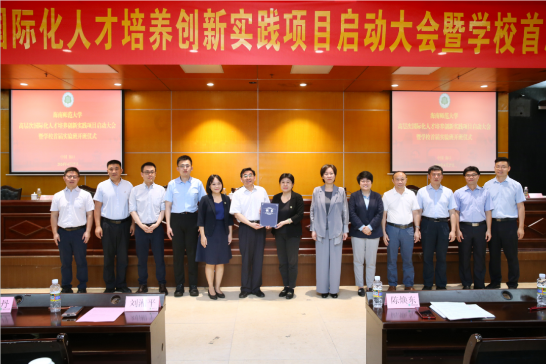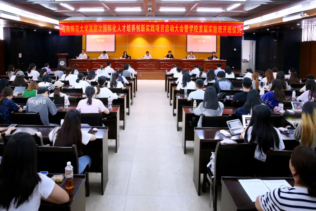 4月27日,海南师范大学高层次国际化人才培养创新实践项目启动大会暨首届实验班开班仪式在龙昆南校区图书馆十楼报告厅举行。教育部中外人文交流中心主任于长学、项目服务单位中科浩博总监李玥琛,我校党委书记许玫、副校长韩小雨、研究生学院、教务处、学生处、国际合作与交流处等部门负责人以及实验班全体学员参会。会议由韩小雨主持。