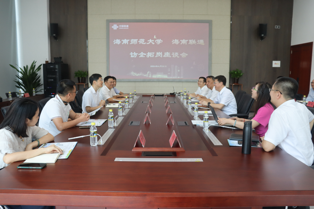 海南联通王绥民、甘泉,海口市分公司王京、叶志,学校招生就业处、数学与统计学院和信息科学与技术学院相关负责人等参加座谈。