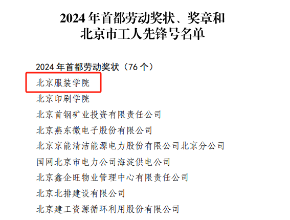 在“五一”国际劳动节到来之际,为大力弘扬劳模精神、劳动精神、工匠精神,不断激励广大职工满怀信心奋进新征程、建功新时代,表彰各行各业、各条战线涌现出的先进集体和个人,4月28日,北京市总工会、北京市人力资源和社会保障局发布《关于授予2024年首都劳动奖状、奖章和北京市工人先锋号的决定》(京工发[2024]11号),北京服装学院荣获“2024年首都劳动奖状”荣誉称号。今年北京市教育系统中只有2所高校获得此项荣誉。