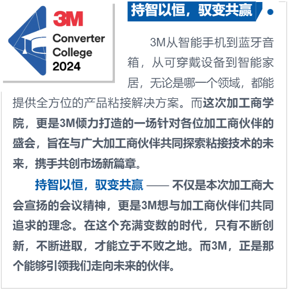 在这个充满机遇与挑战的时代,3M希望成为你值得信赖的合作伙伴。2024 3M中国加工商学院,将是你不可错过的行业交流机会。
